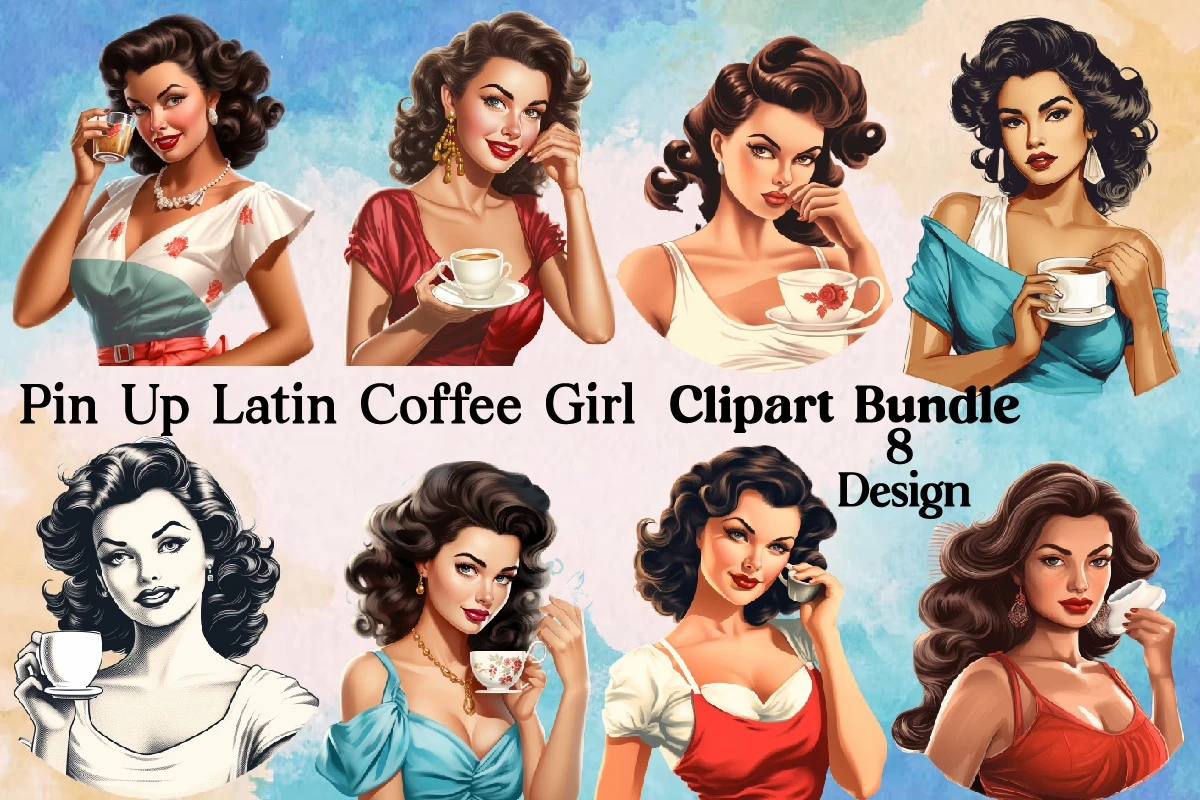 Watercolor Pin Up Latin Coffee Girl Clipart PNG Bundle