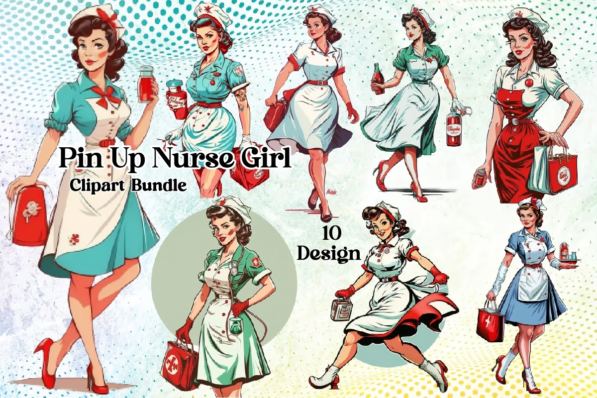 Watercolor Pin Up Nurse Girl Clipart PNG Bundle