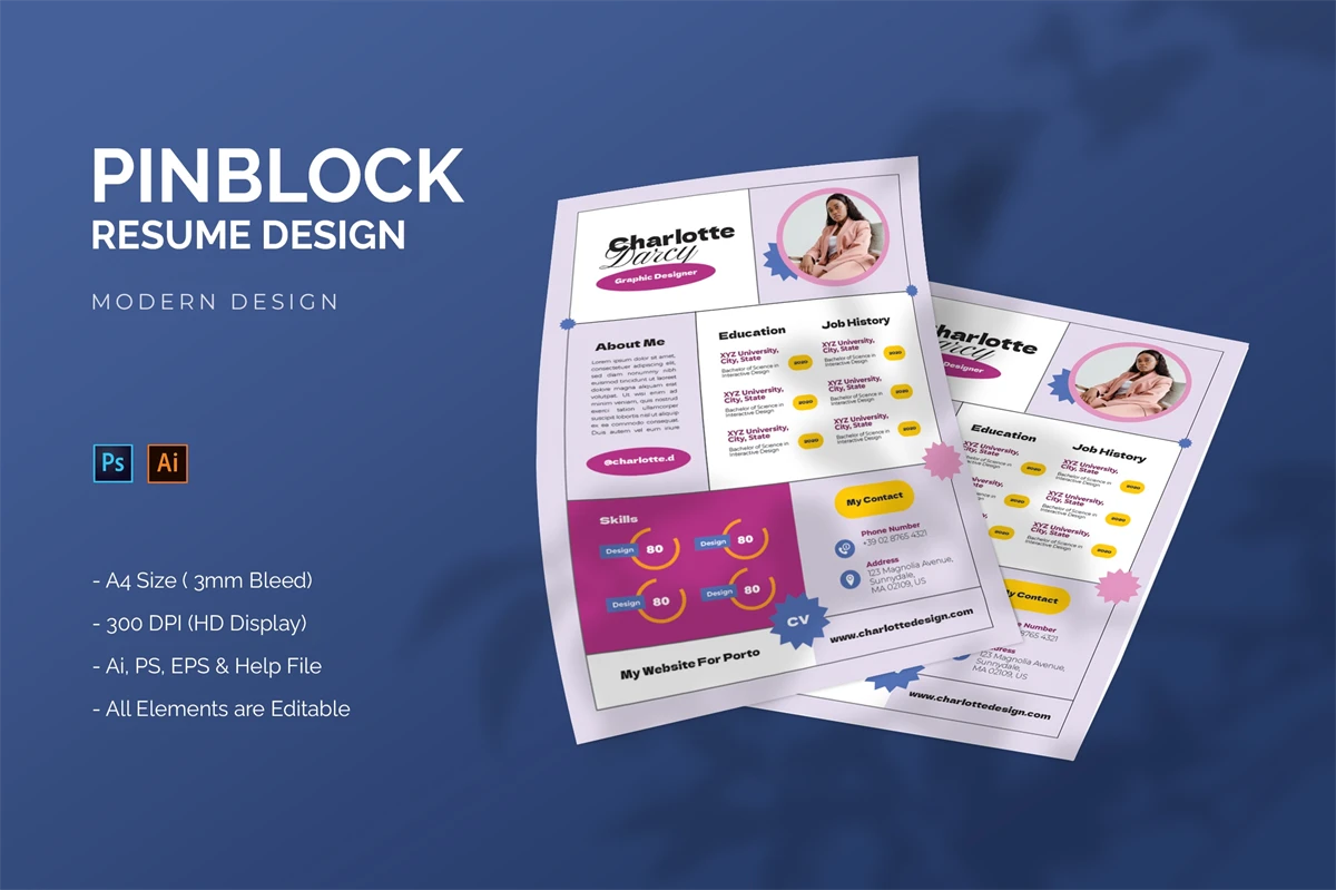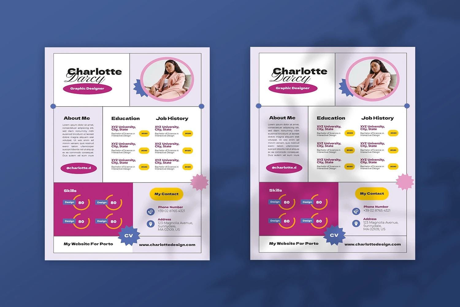 This CV resume design template lets you tell your story to potential employers or collaborators by showcasing your skills, experience, and accomplishments. It presents your credentials clearly and professionally to draw attention and highlight your strengths.