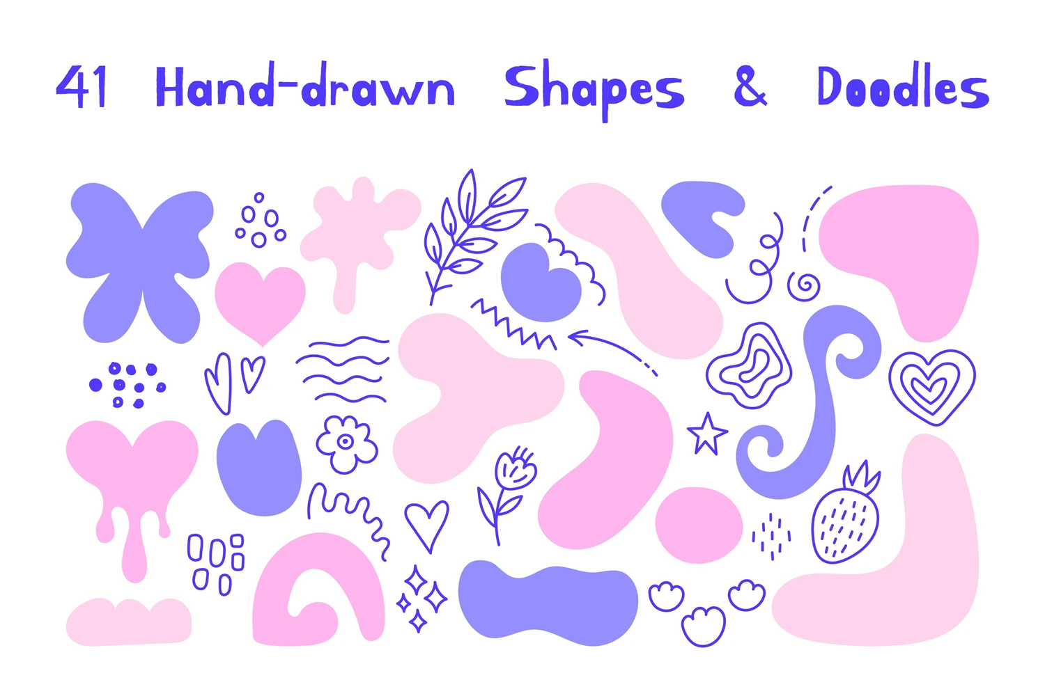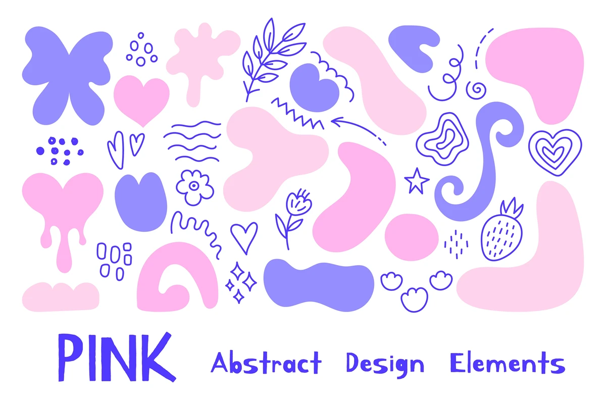 Modern pink and purple organic abstract shapes and doodles. Hand-drawn colorful wavy geometric forms, spots, dots and lines. Trendy Y2k aesthetics for card making, greeting card, poster, kids, girls, woman, beauty topics, social media design. Vector illustration.