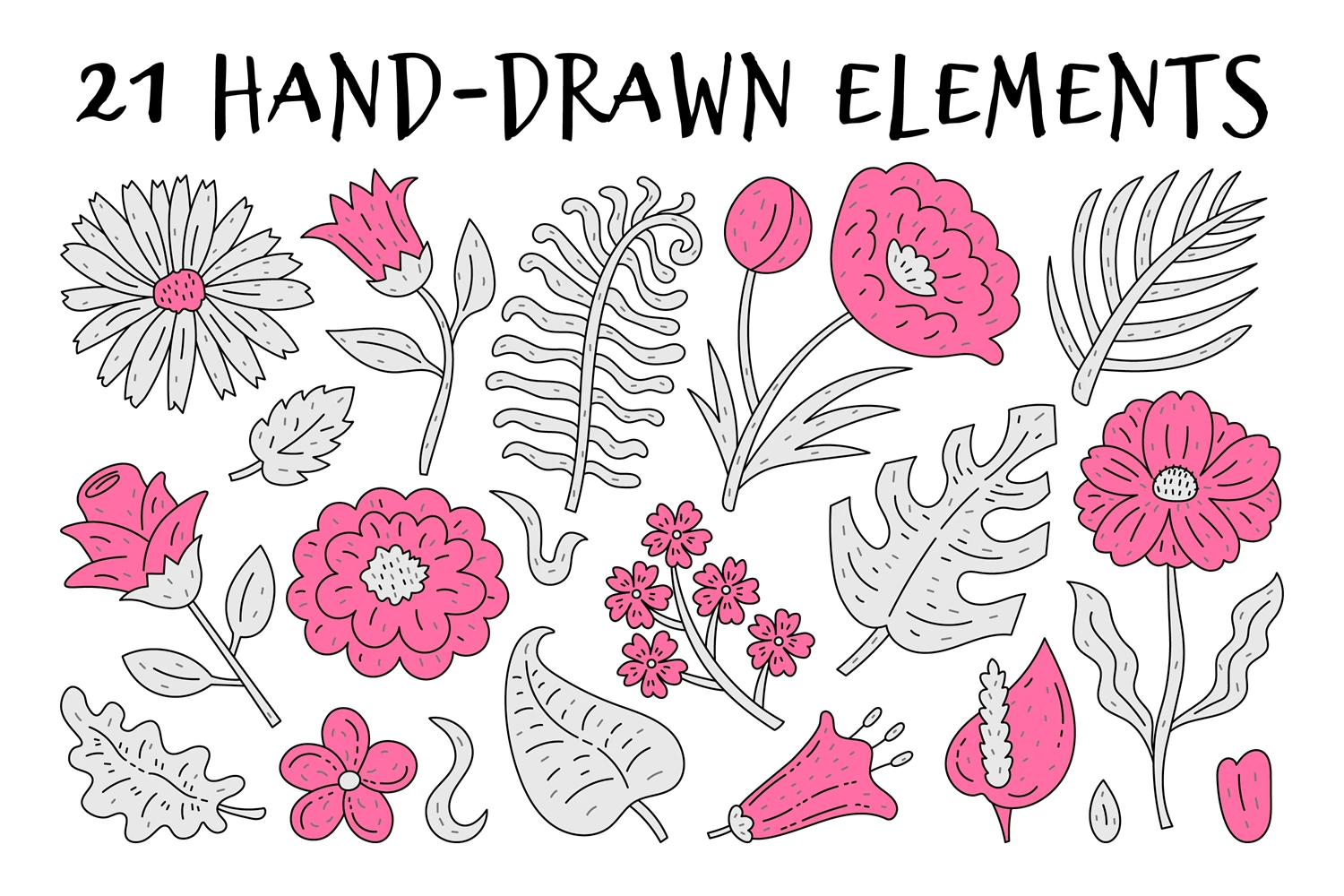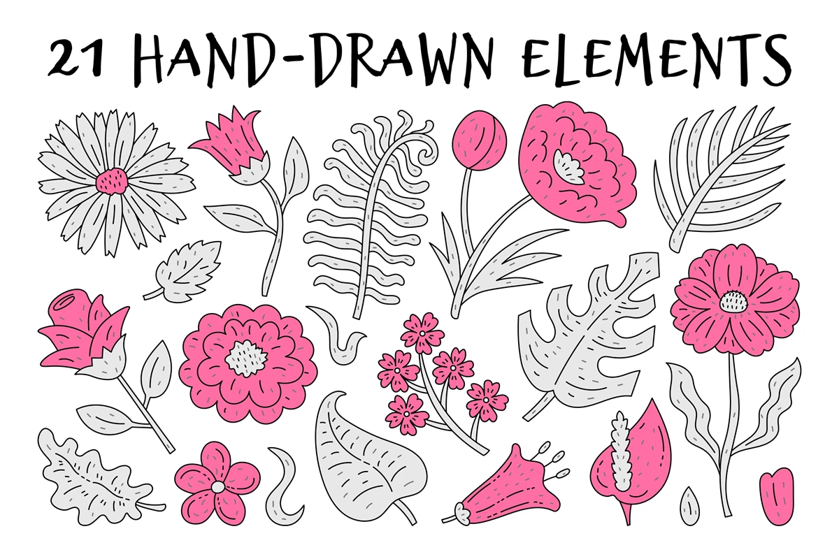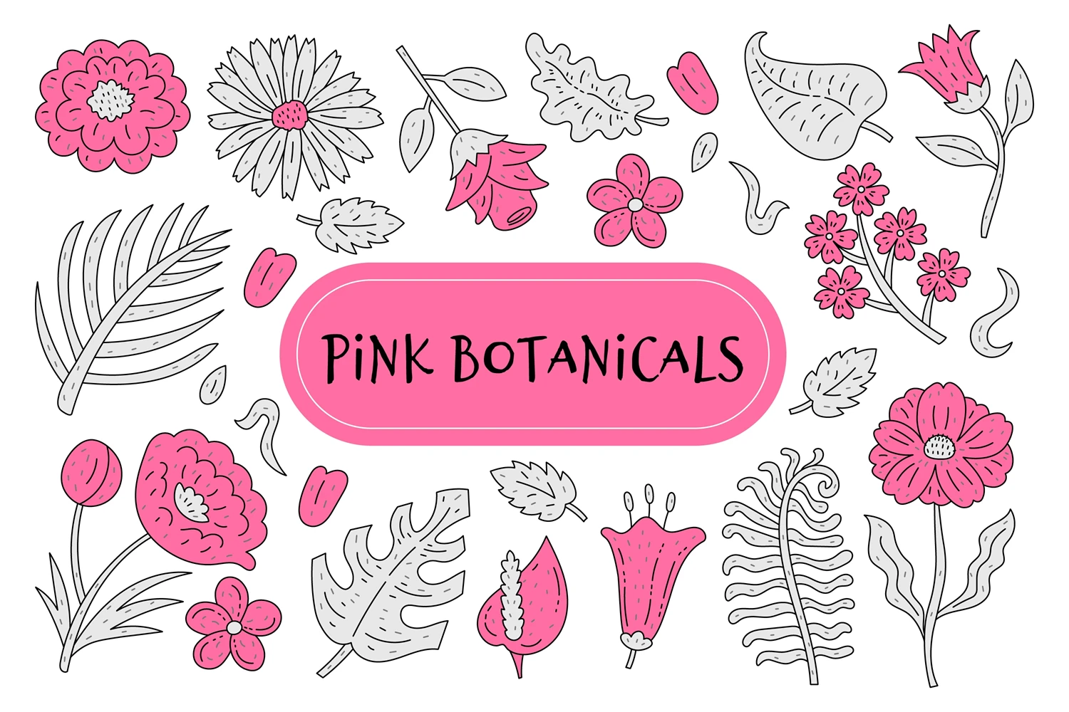 Cute girlish y2k collection with hand-drawn pink and gray nature elements. Cartoon outline botanicals set with various doodle flowers and leaves. Stylish chamomile, Daisy, Rose, Poppy, Monstera, Anthurium, Spathiphyllum, Peony elegant decorative vector illustrations. Collage design elements.