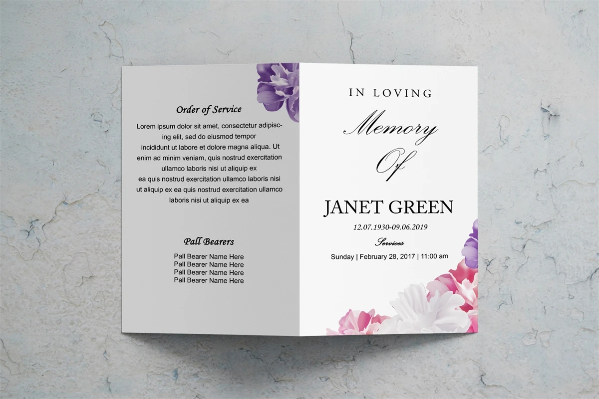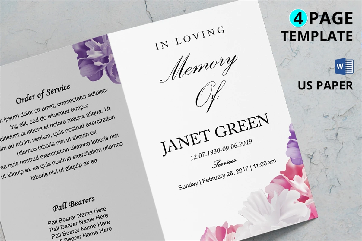 8.5x11 Inches Word, Publisher and CANVA Funeral Program Template.