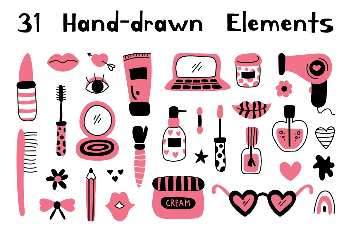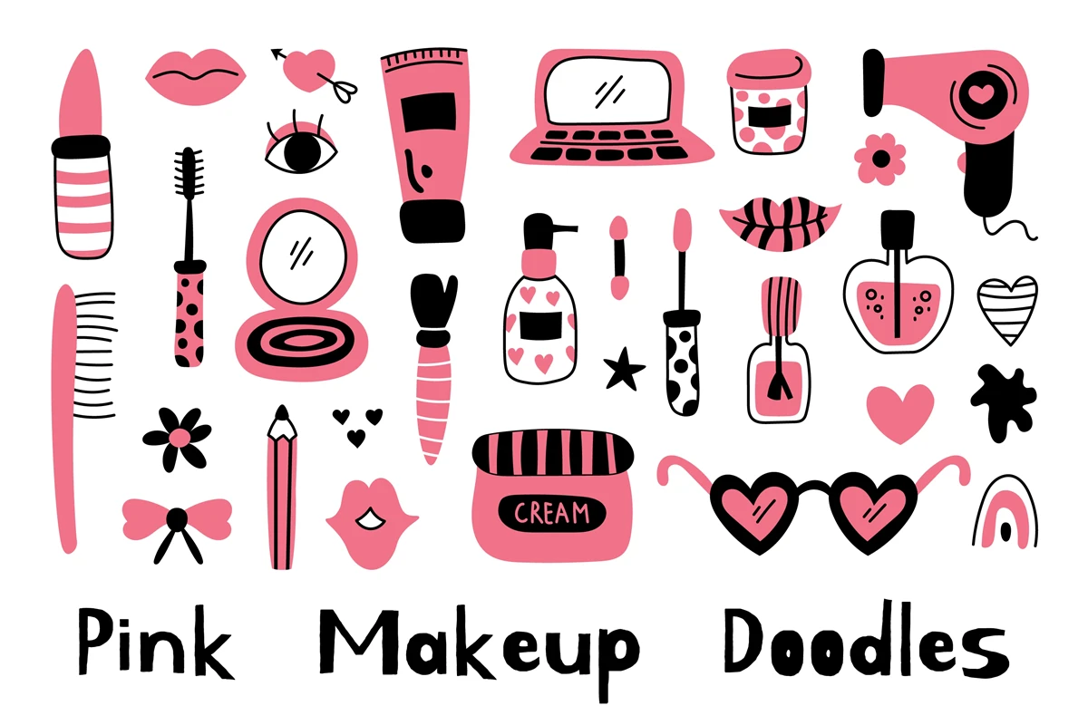 Modern hand-drawn collection of beauty and skin care cosmetics elements. Trendy pink colored makeup products in doodle style. Femininity, fashion, woman, girl minimal aesthetics. Flat design. Vector illustration.