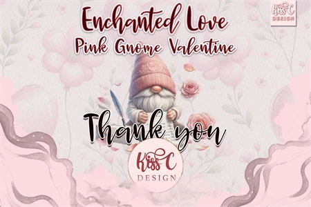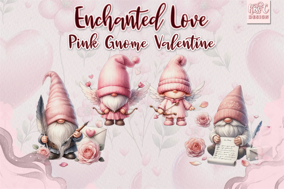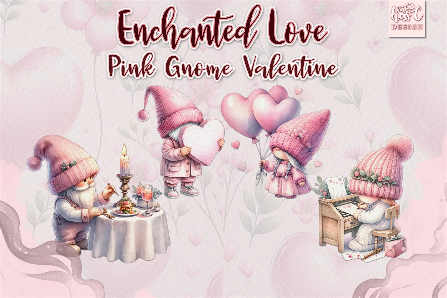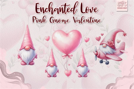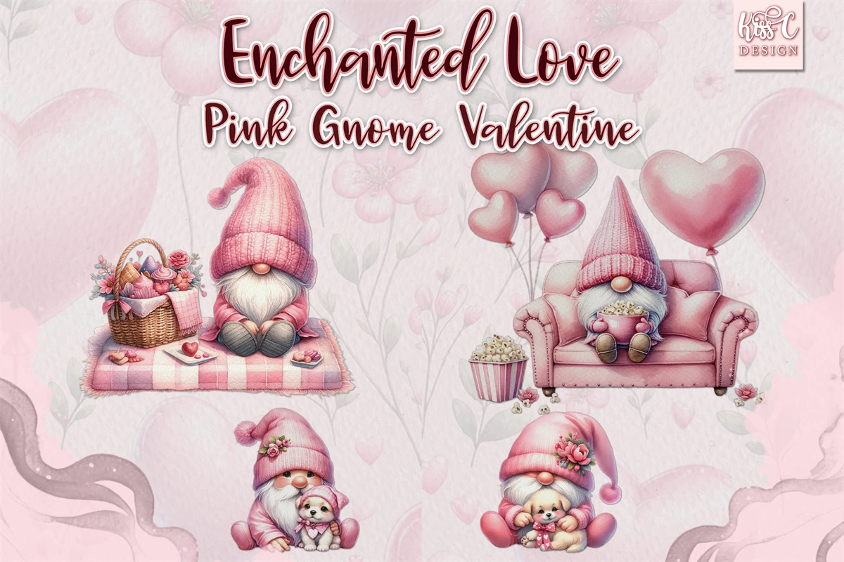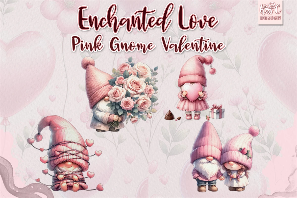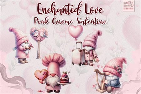 Pink Valentine Gnome Enchanted Love Illustration Clipart.