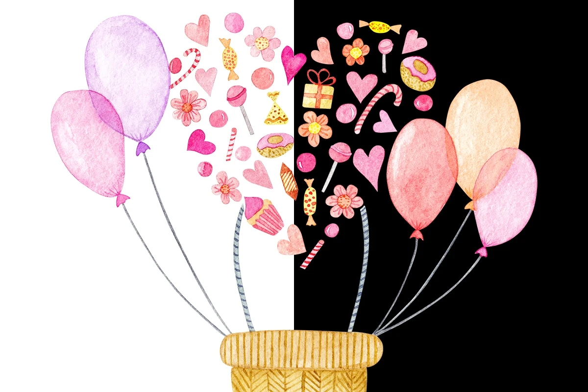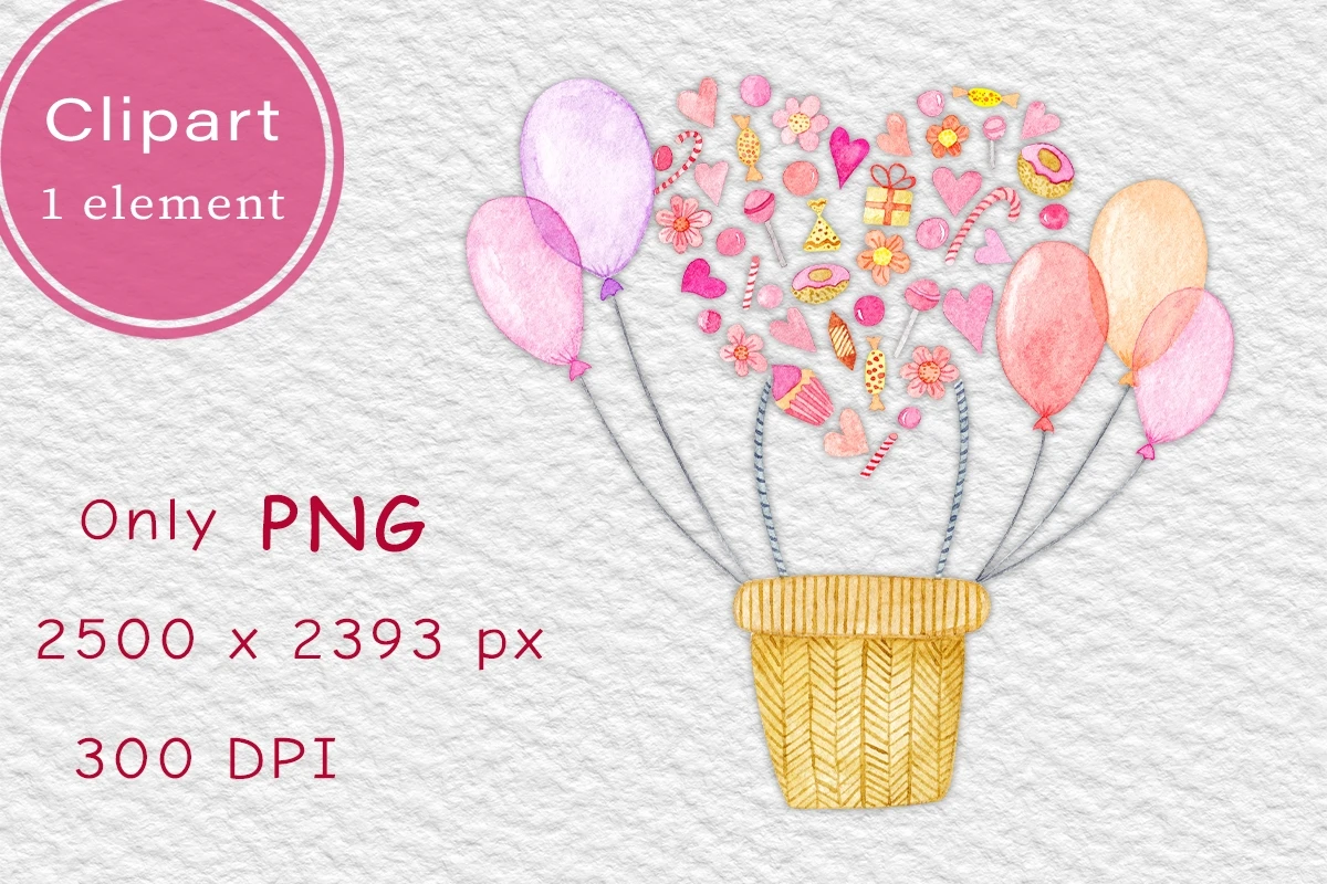 Cute watercolor illustration - pink balloon, balloons and sweets. For the design of children's printing, postcards, wrapping paper, prints, stickers. Sublimation for t-shirt, mug, notepad. For holiday design for Valentine's Day, birthday, kids party, mother's day. Poster for the children's room.