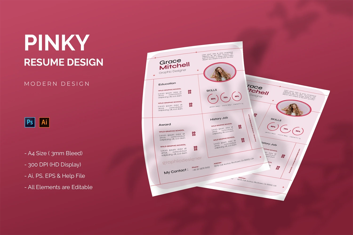 This is **Pinky - Resume Template** Get it now!, CV Resume for All business and personal needs. This design is great for your business and will make your interest, elegant, and easily editable according to your needs (**Adobe Illustrator, Adobe Photoshop**). You can use this CV Resume for personal purposes, or company purposes, I hope you enjoy this, Hope you Like it, and dont forget to rate it, Thanks.