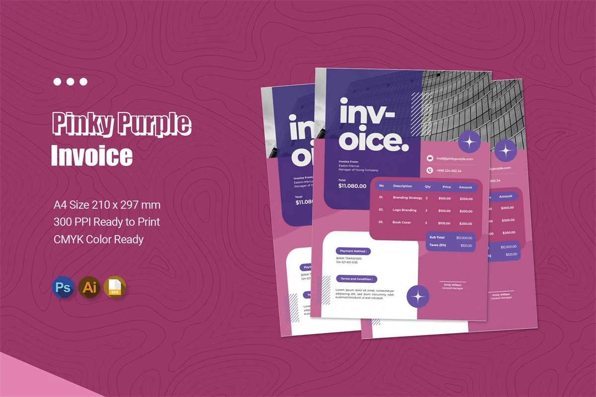Use our invoices to make your bookkeeping easier and to impress your clients with an invoice display that has a modern, elegant design and strong typography. This invoice template is easy to use and customizable, making it perfect for any medium.