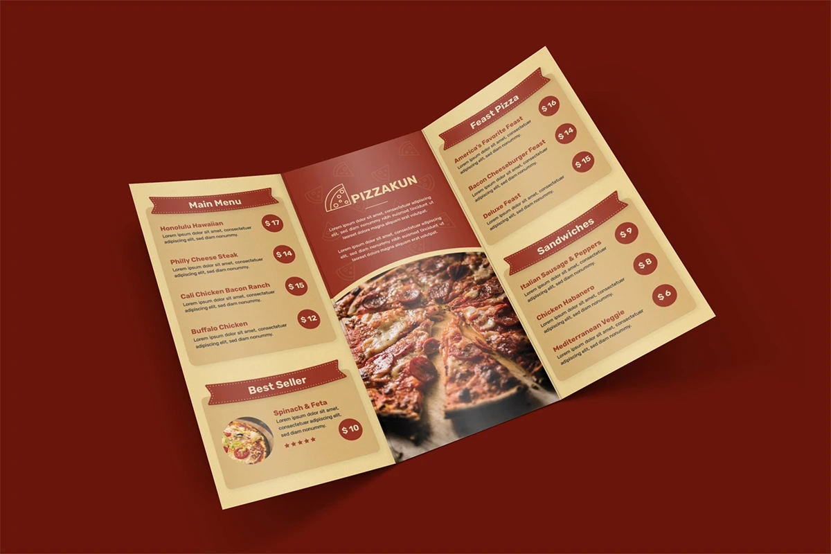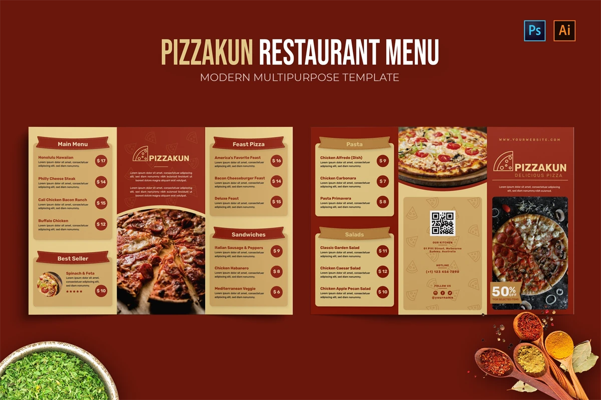 Pizzakun - Restaurant Menu. This template is great for your business and will make your customers interested, elegant, and easily editable according to your needs, this restaurant menu is perfect for, promos, cafes, hotels, resort shops online. etc. I hope you enjoy this restaurant menu