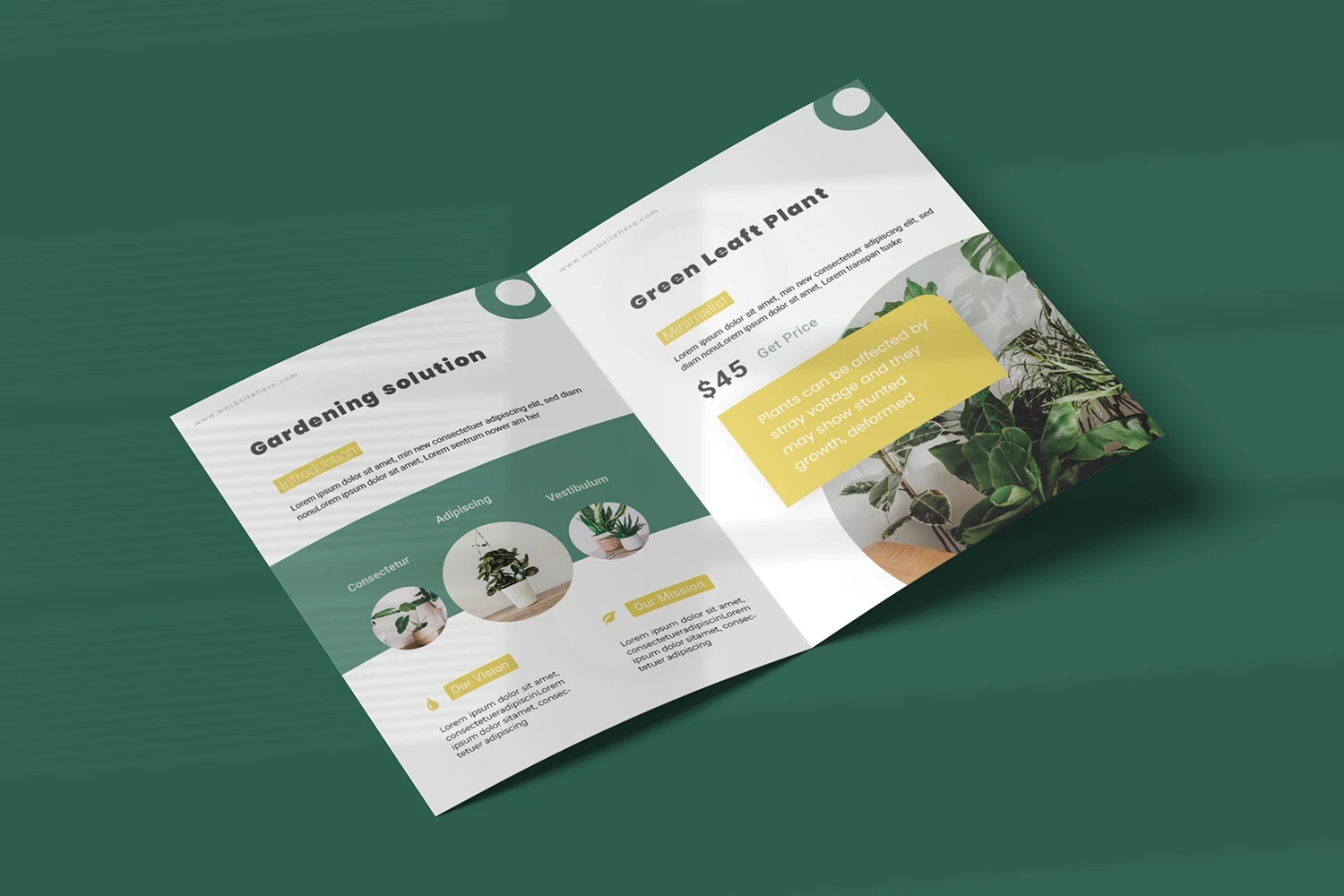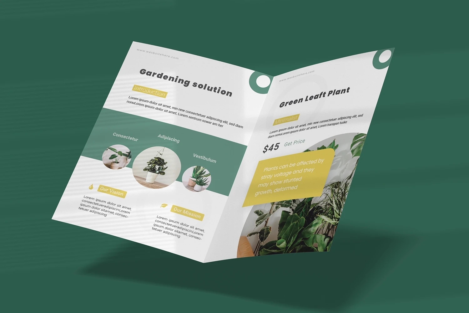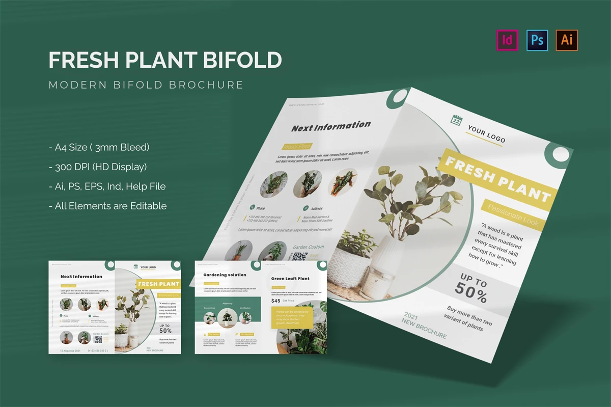 Plant And Gardening - Bifold Brochure We present this Bifold Brochure for you, simple and very elegant, and this Bifold Brochure is suitable for all types of your business, made with Adobe InDesign (INDD), Adobe Photoshop (PSD) and Adobe Illustrator (AI), very easy to customize, Hope you Like it, dont forget to rate, Thanks.