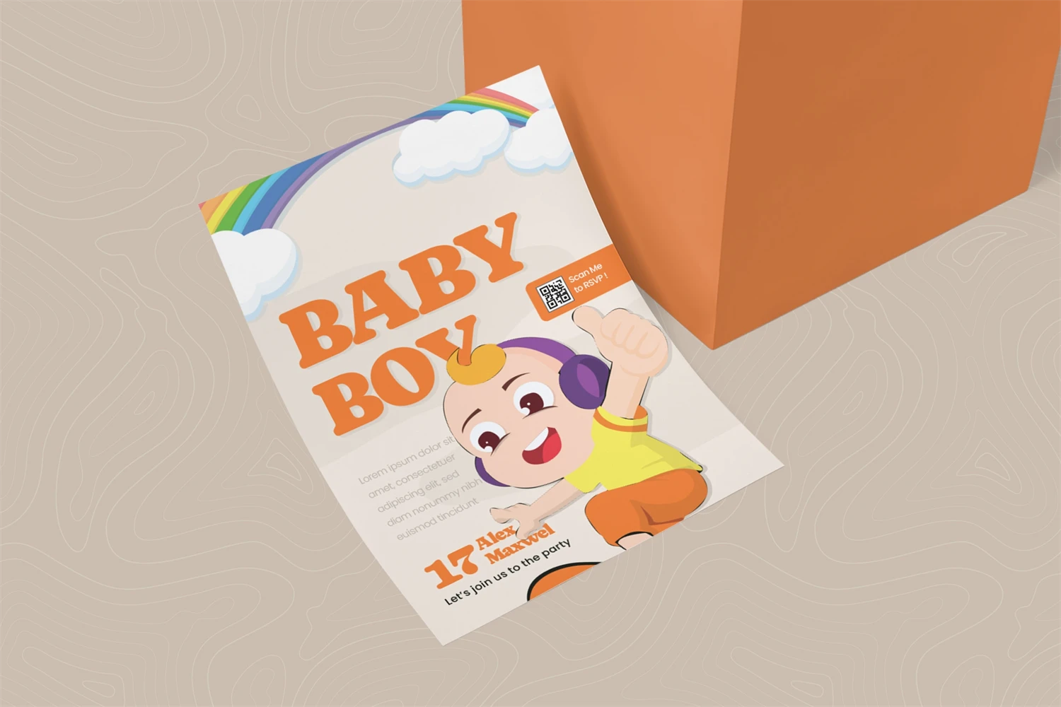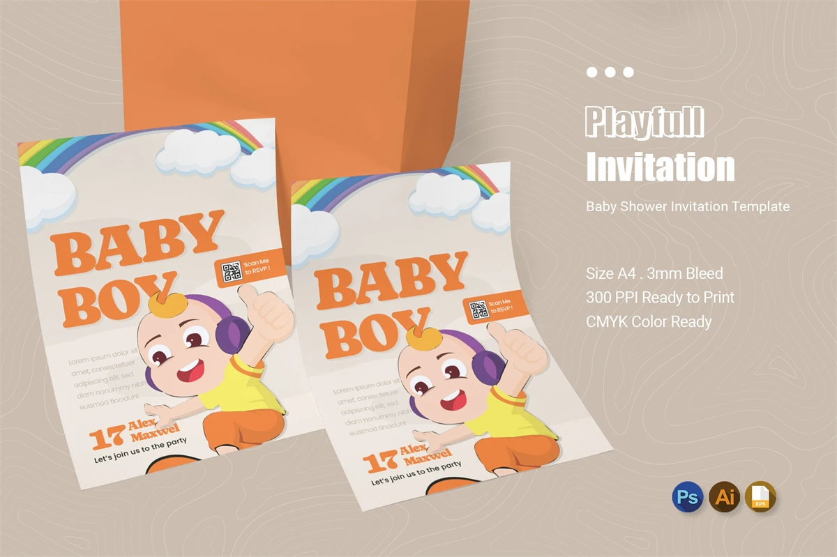 This baby shower invitation card template makes your invitation card look enjoyable, professional, and also simple. It's perfect for parents who want to celebrate the birth of their baby. You can easily to customize to your needs if using **illustrator** you just need to Drag your Image, select the image and placeholder, then right click select Make