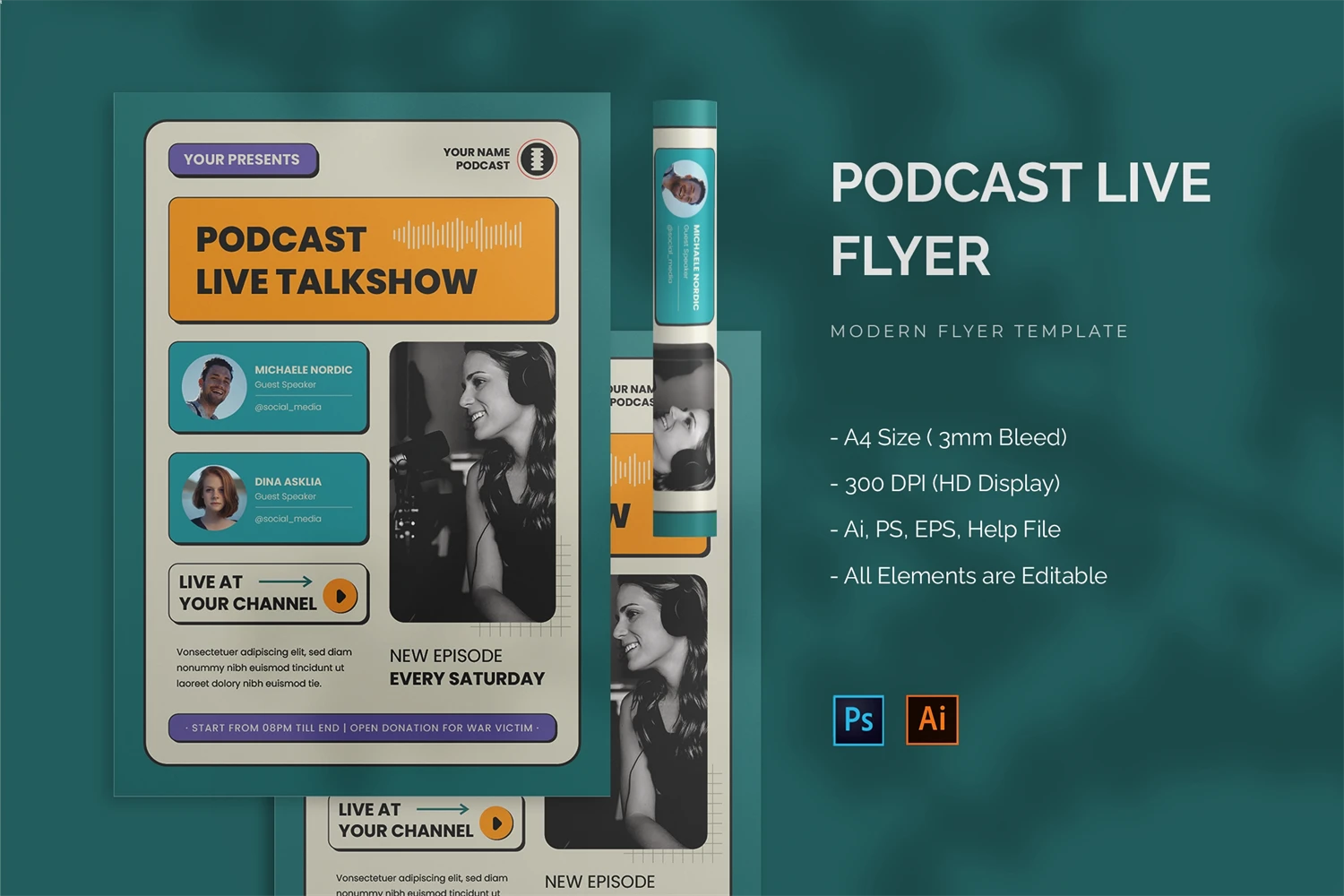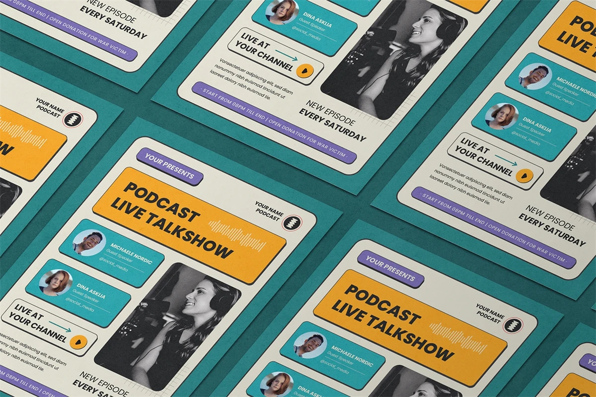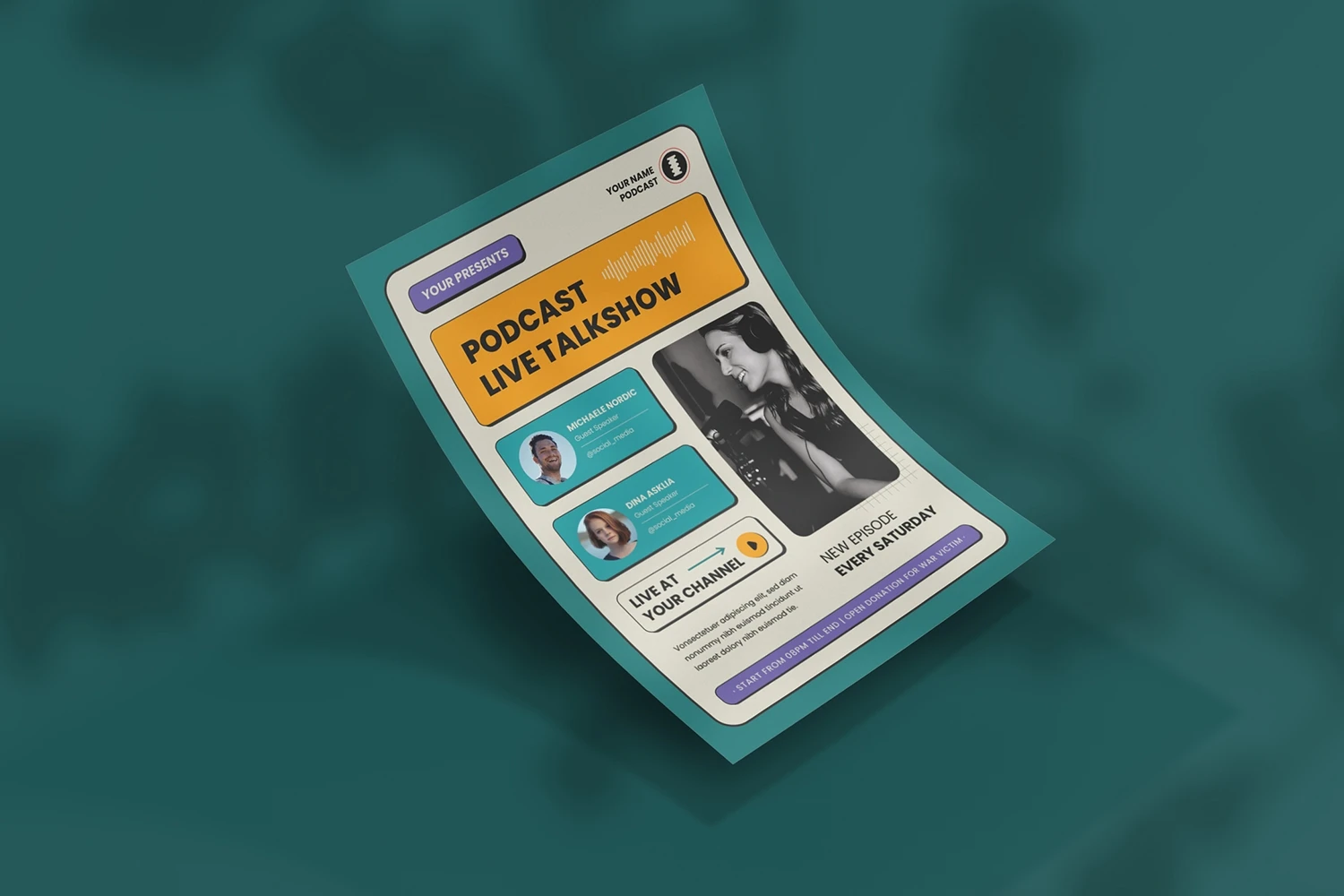 Podcast Live - Flyer. This Flyer template is designed for your company's business needs. very clean and elegant, and also easily edited and adjusted to your liking