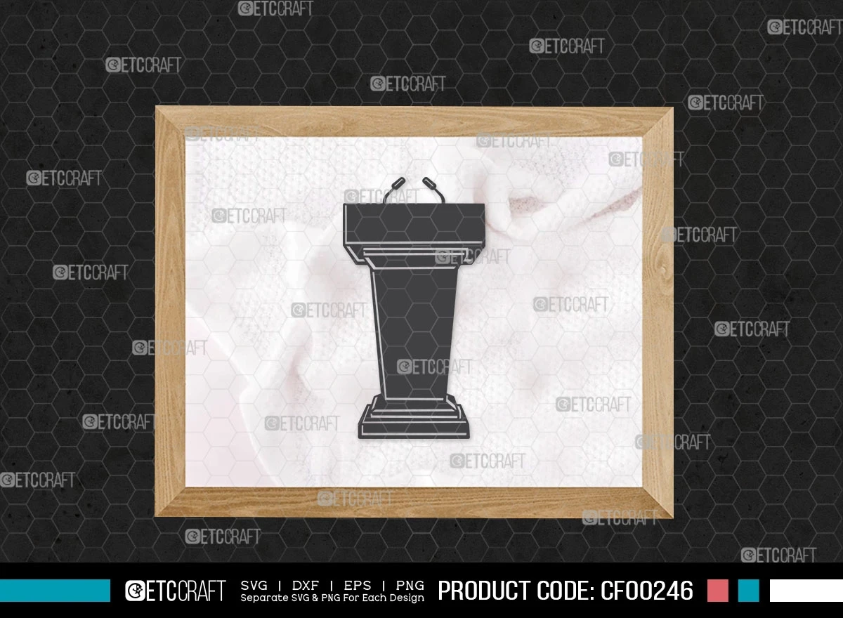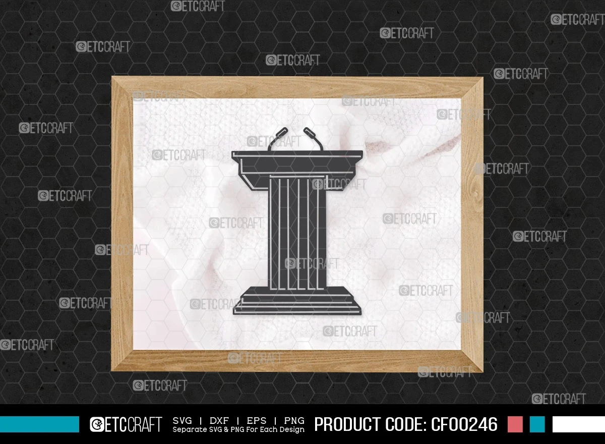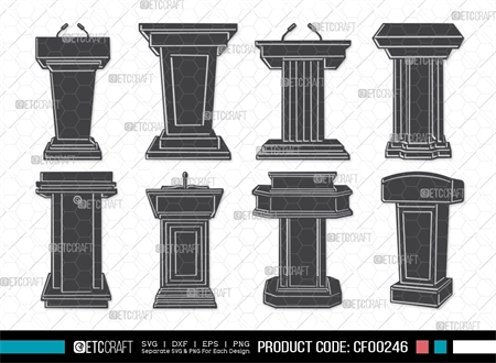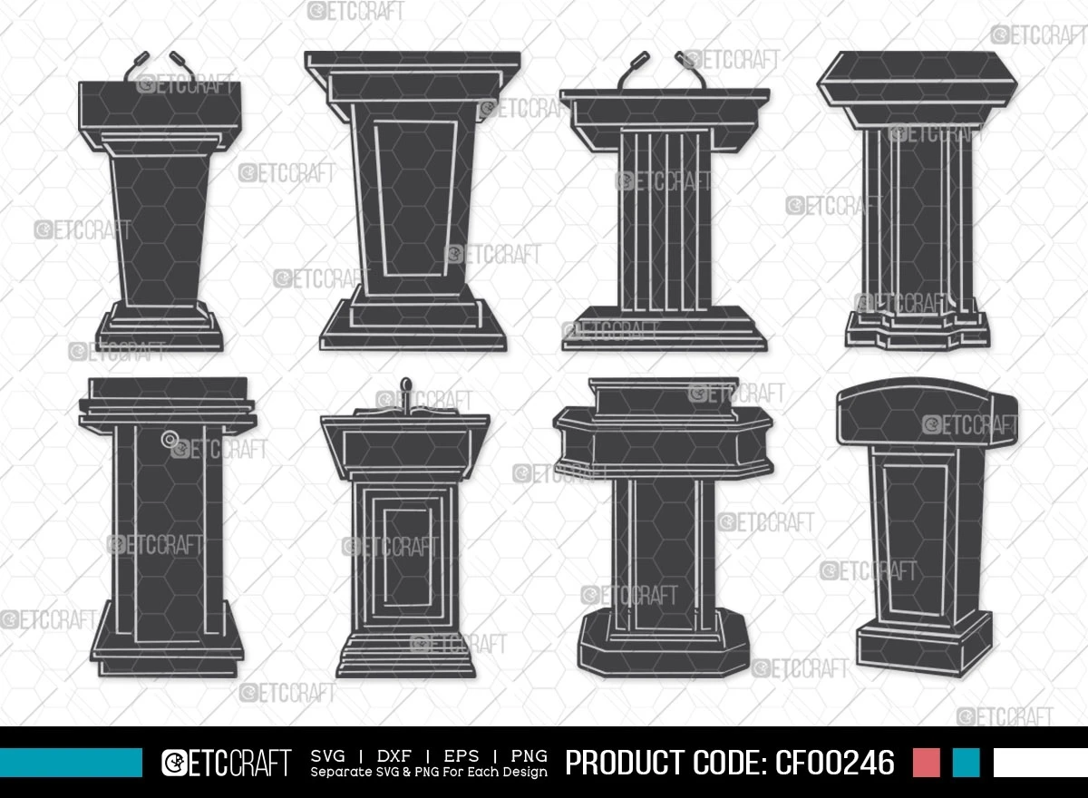 Whether you're an educator seeking to enhance your teaching materials, a presenter preparing an engaging presentation, or a designer looking to add a touch of professionalism to your projects, our "Podium Stand Silhouette Wooden Lecture Podium Stand With Microphone & Speaker SVG Cut File Bundle" is the ultimate resource to elevate your creative and educational work with a touch of refinement and poise.