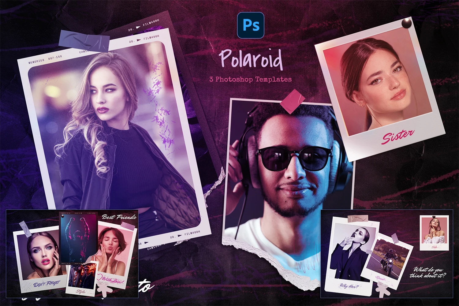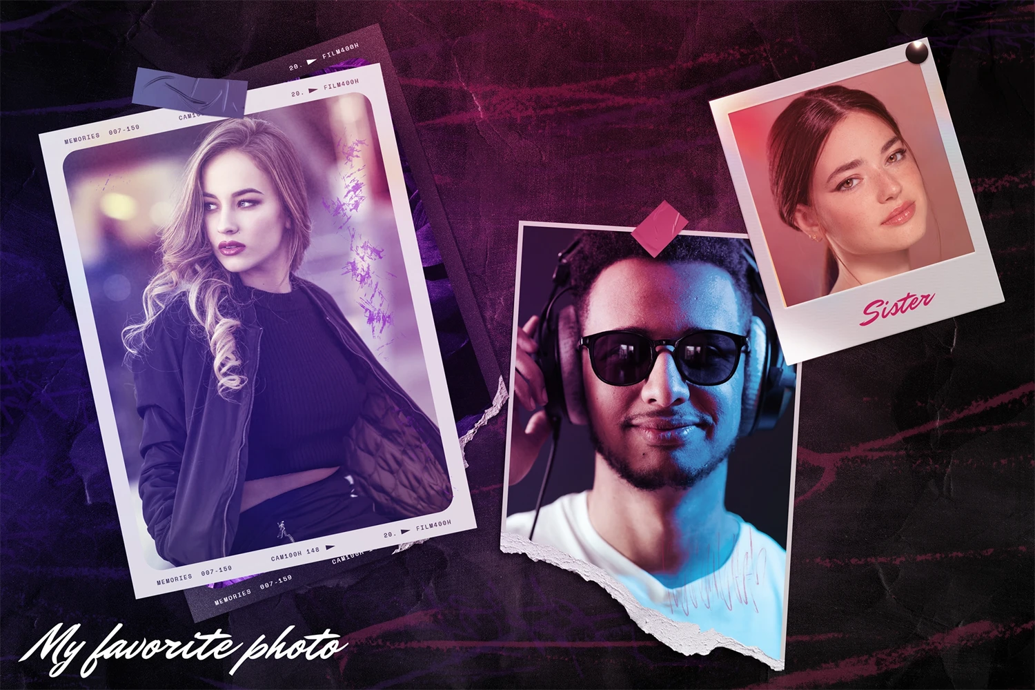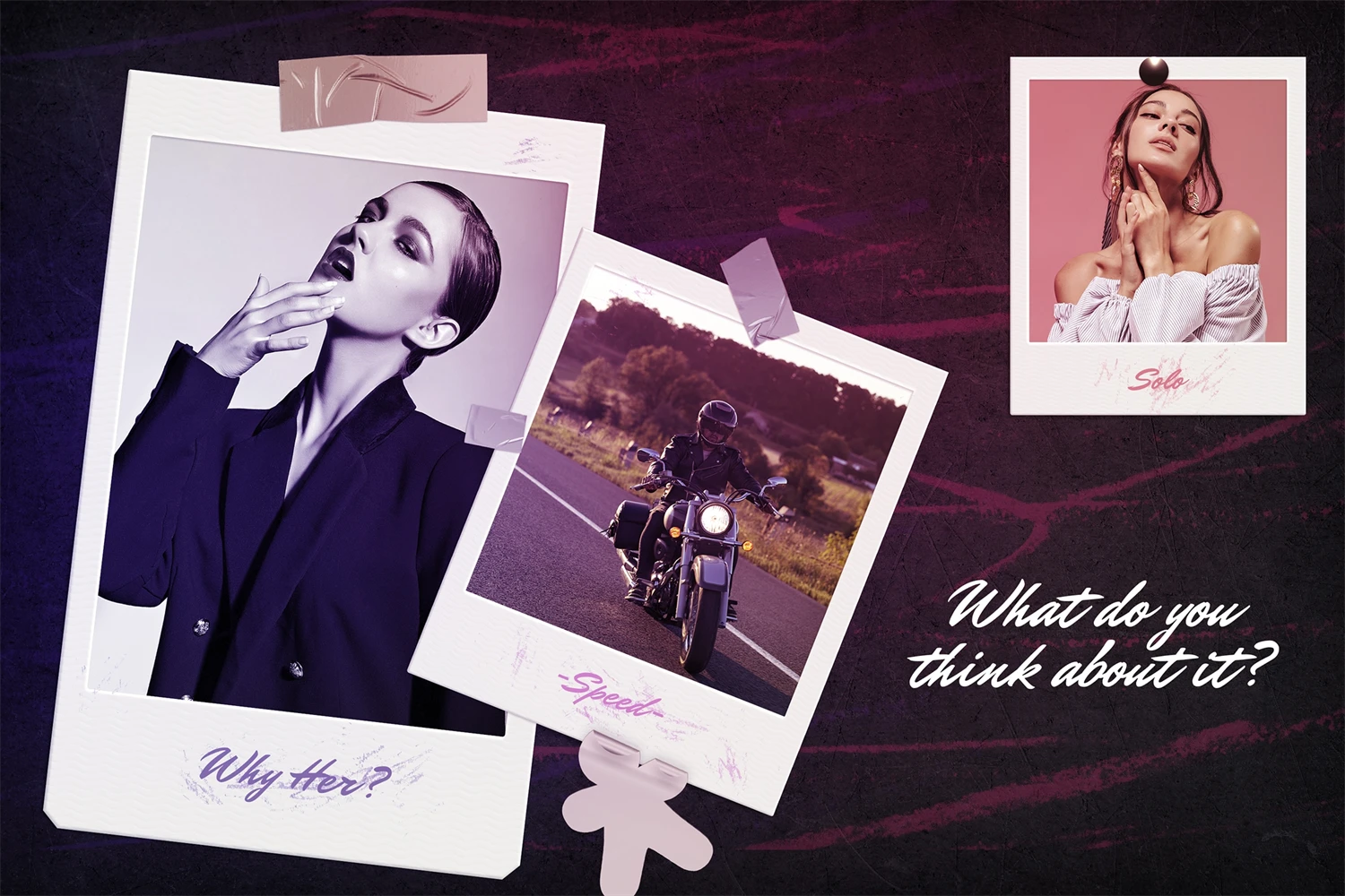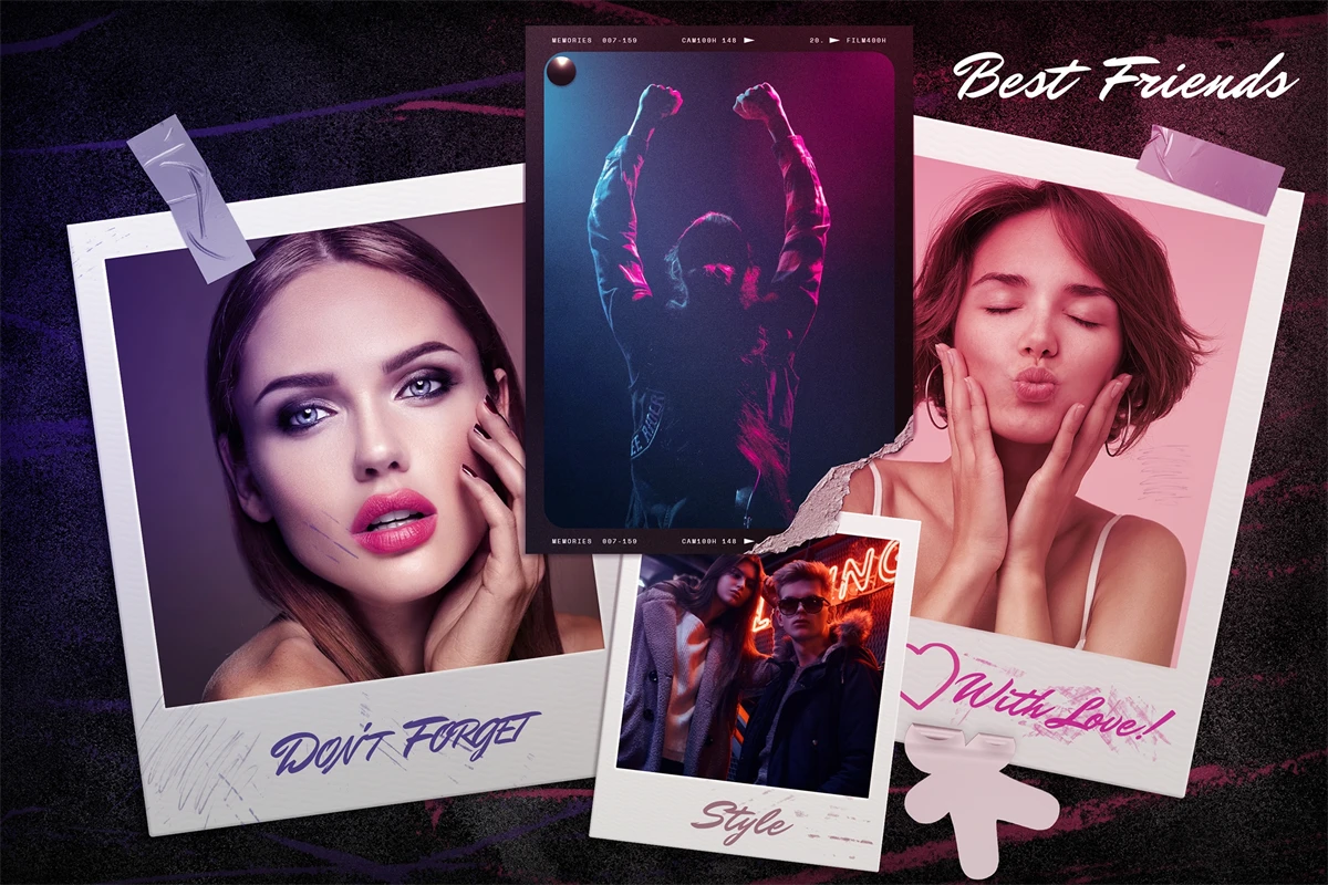 Polaroid photo mockup for your photos. Cool compositions with polaroid photos and torn photos. Cool double light, night club style. Get cool content with this mood board creator. You can make Instagram posts, Facebook posts, website banners, presentation slides, magazine pages and much more.