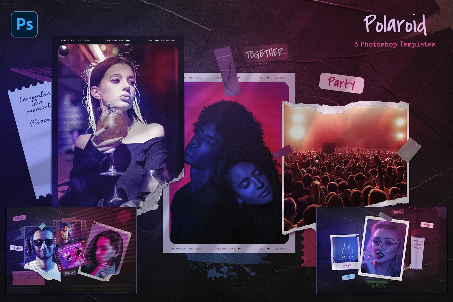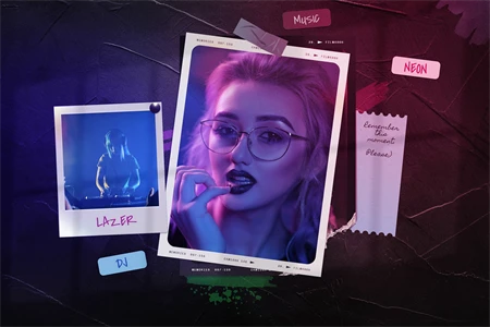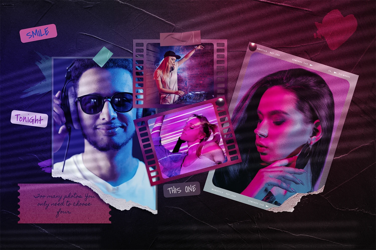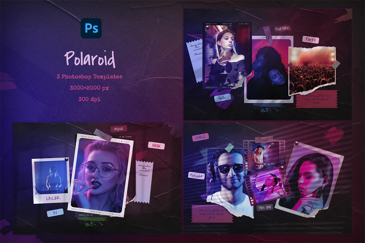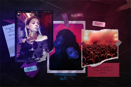 Polaroid photo mockup for your photos. Cool compositions with polaroid photos and torn photos. Cool double light, night club style. Get cool content with this mood board creator. You can make Instagram posts, Facebook posts, website banners, presentation slides, magazine pages and much more.