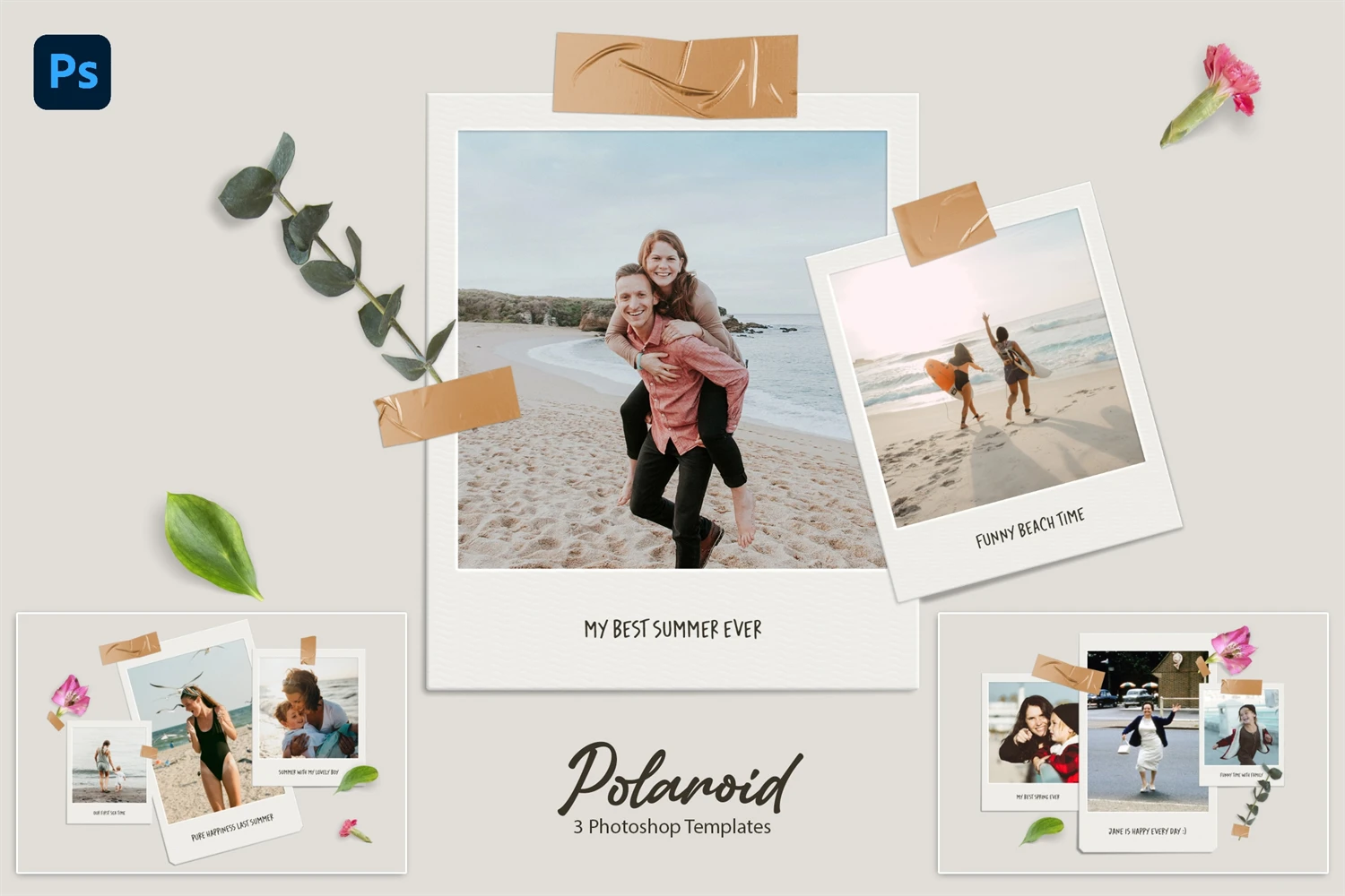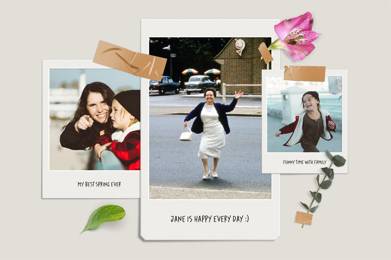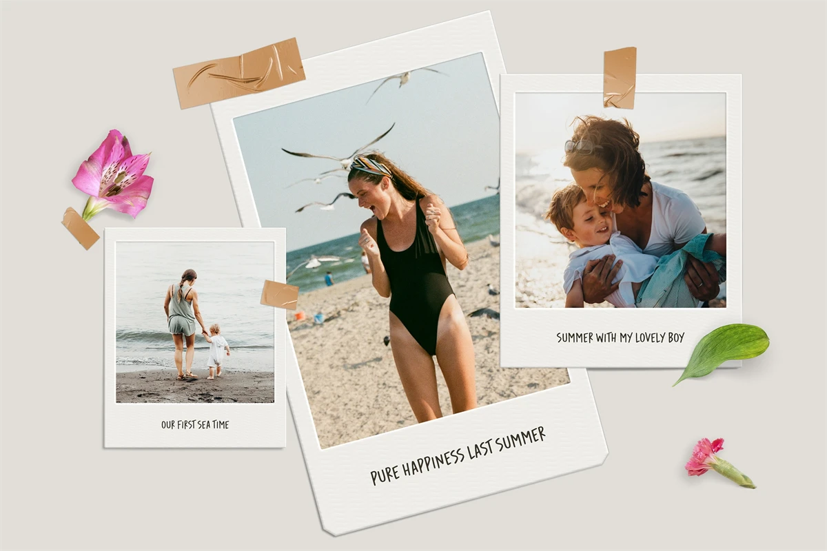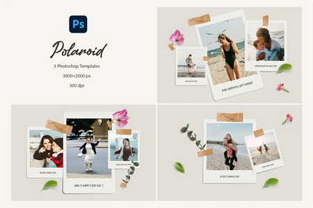 Polaroid photo mockup for your photos. Cool compositions with polaroid photos, leaves and flowers. Get cool content with this mood board creator. You can make Instagram posts, Facebook posts, website banners, presentation slides, magazine pages and much more.