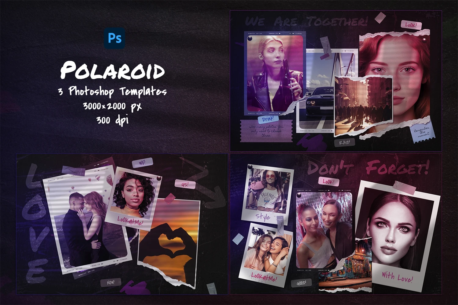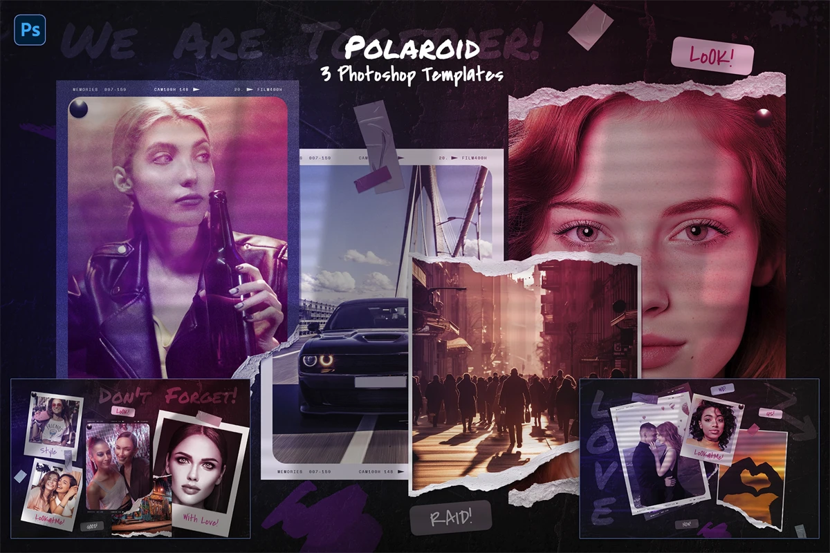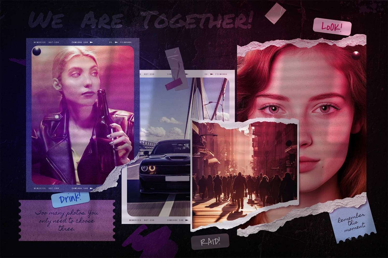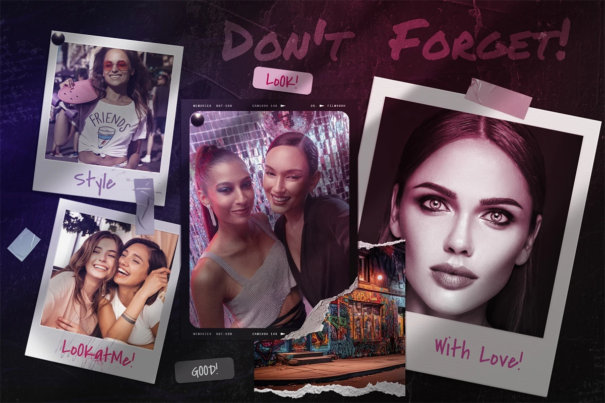 Polaroid photo mockup for your photos. Cool compositions with polaroid photos and torn photos. Cool double light, night club style. Get cool content with this mood board creator. You can make Instagram posts, Facebook posts, website banners, presentation slides, magazine pages and much more.