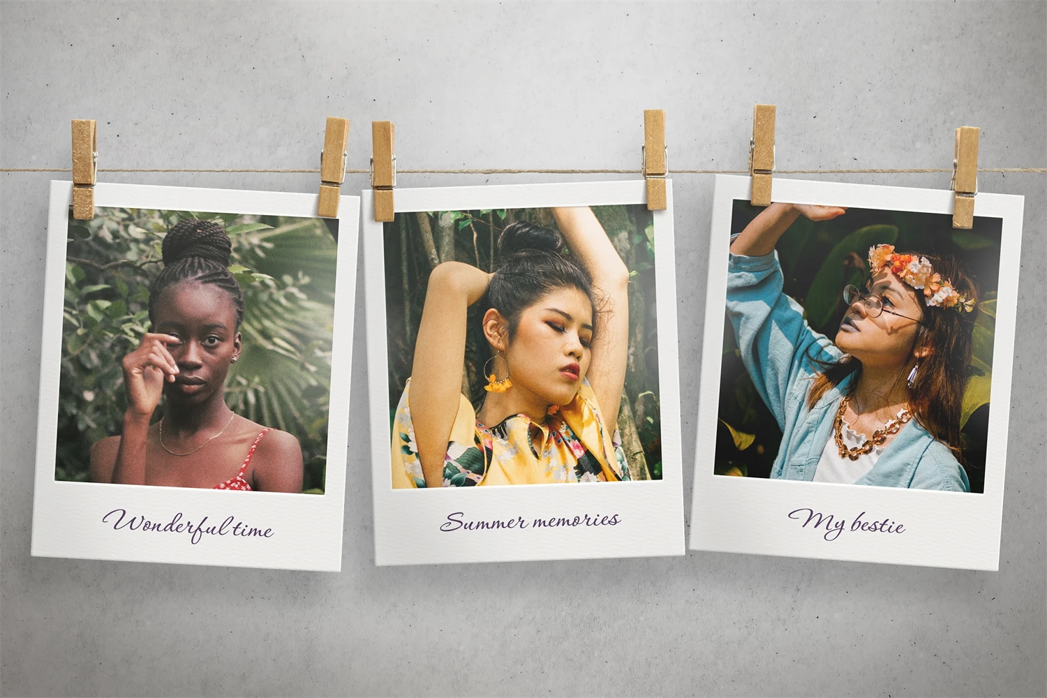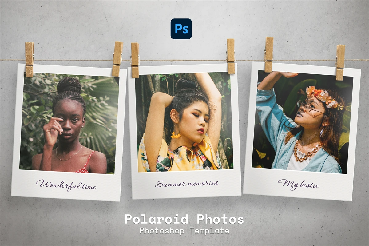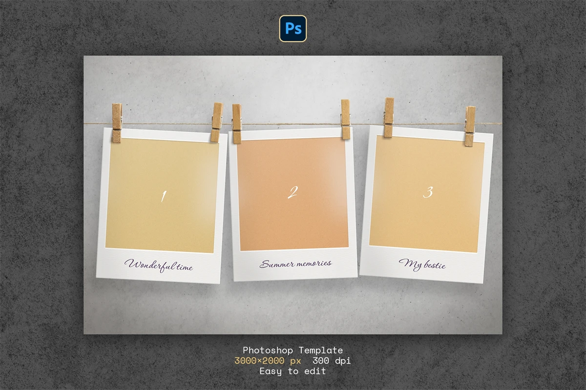 Polaroid photo mockup for your photos. 3 polaroid photos hanging on a rope with clothespins. You can make Instagram posts, Facebook posts, website banners, presentation slides, magazine pages and much more.