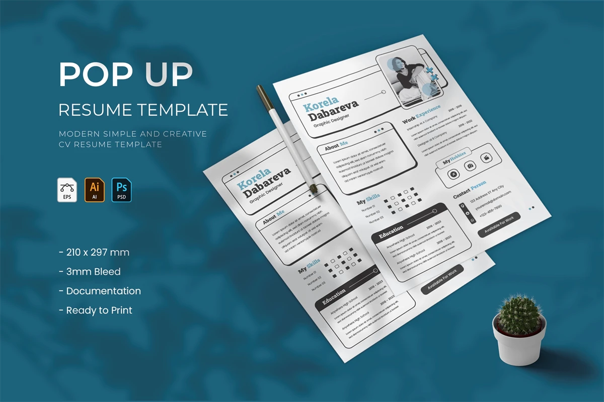 creative resume and cover letter template that will make your resume stand out from the hundreds of resumes employers get. It gives you the information you need, such as your name, contact information, social media links, education, experience, skills and interests. Also, it comes with three different color schemes.