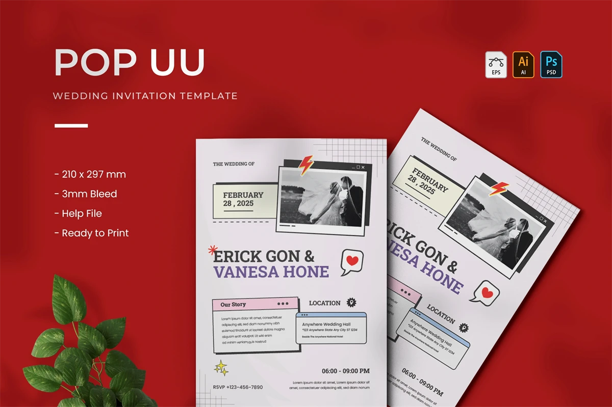 For the couple that wants to express their individuality, this wedding invitation is the right choice. In addition to the print size, we will also offer you with the digital size for Instagram Post and Instagram Story. Facebook and other social media sites also benefit from this. The accompanying AI file is fully vector, so you may scale it to any size without compromising the design.