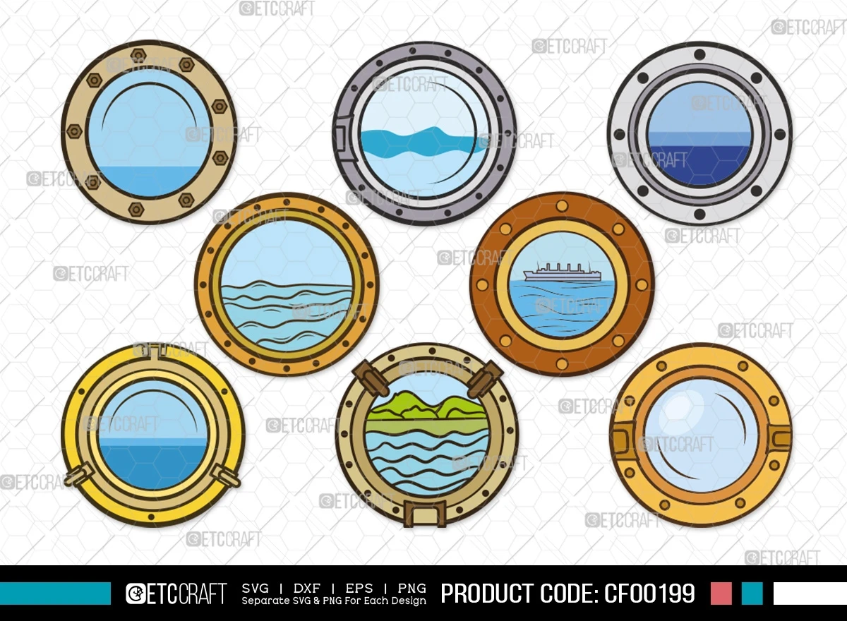 Dive into a world of maritime wonders with our Porthole Clipart Sea Exploration Boat Submarine Ship Window SVG Cut File Bundle. Explore the depths of creativity and bring the allure of the ocean to your projects.