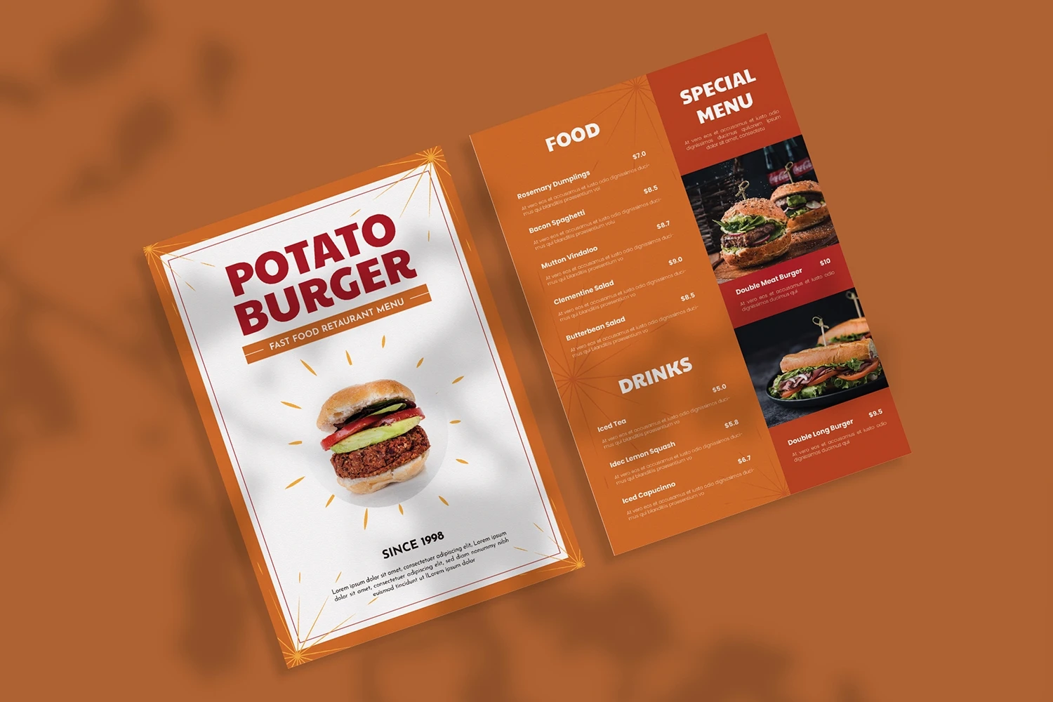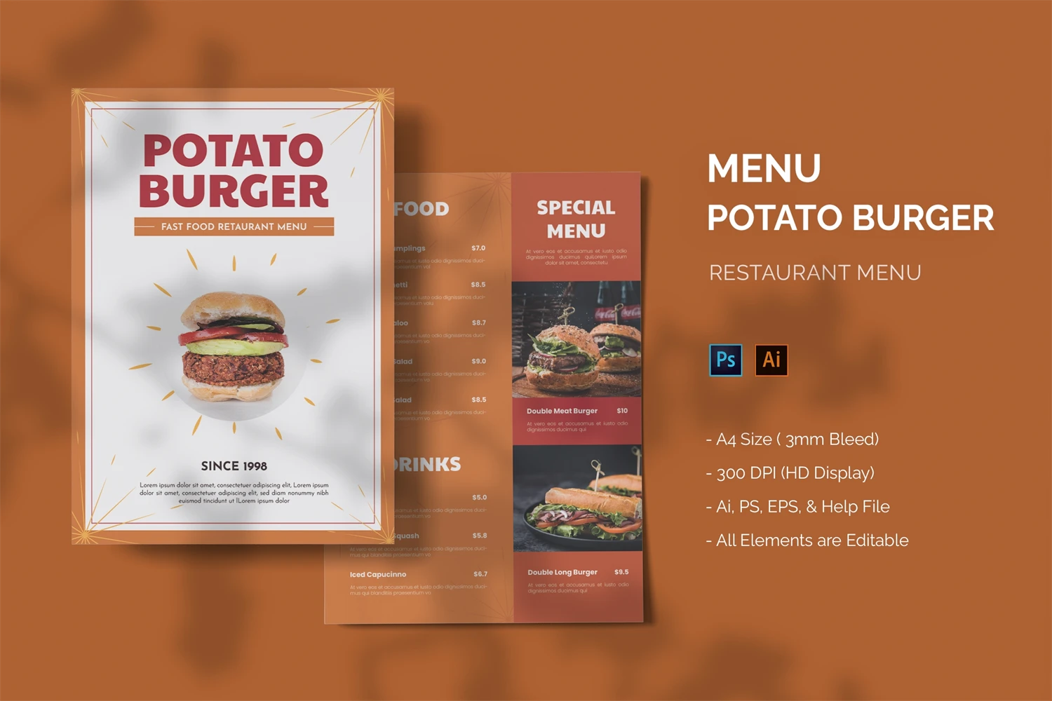 Potato Burger - Restaurant Menu. This template is great for your business and will make your customers interested, elegant, and easily editable according to your needs, this restaurant menu is perfect for, promos, cafes, hotels, resort shops online. etc. I hope you enjoy this restaurant menu