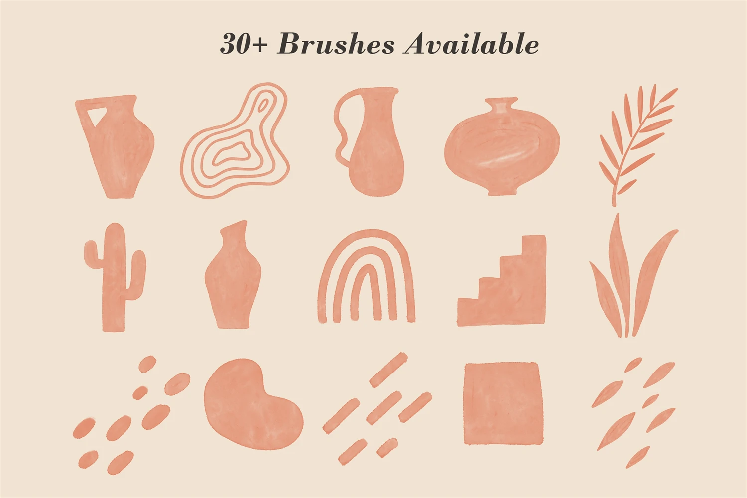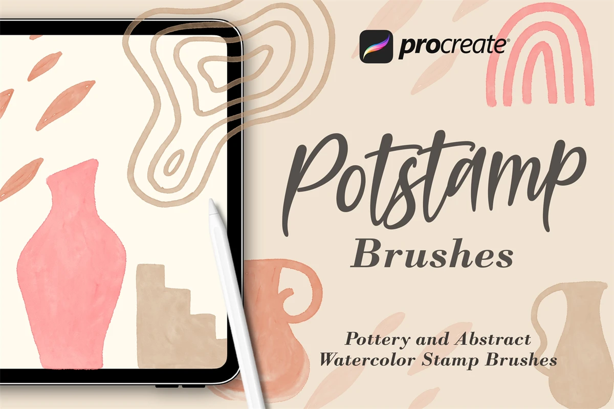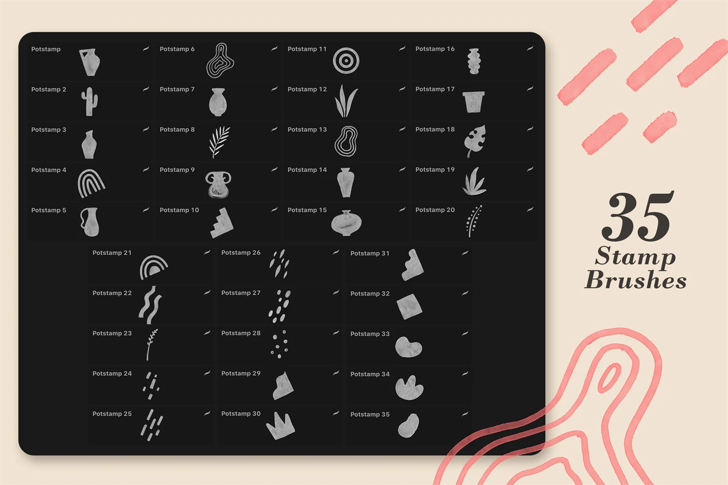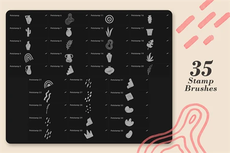 **Potstamp ** In this package you will find everything you need - for example, making logos, illustrations, or special backgrounds!. Using a brush is very simple - just place the brush strokes and select the appropriate brush from the brush panel.