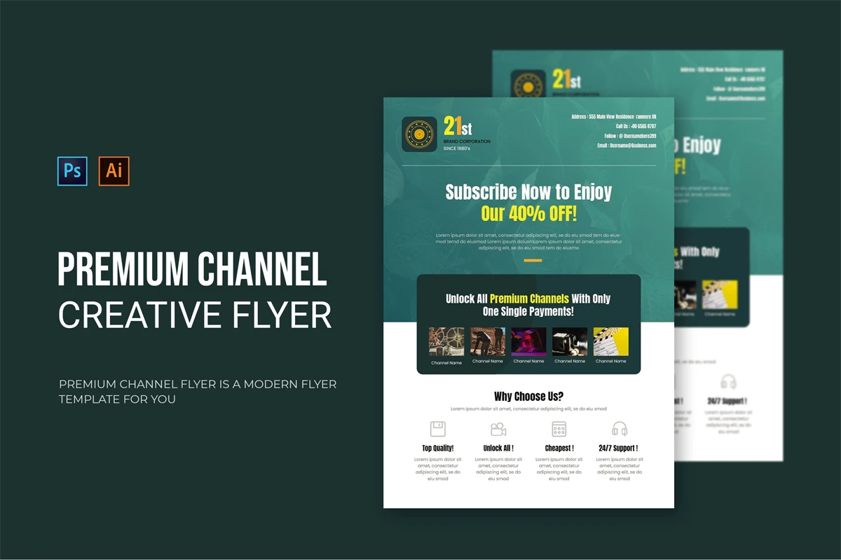 Premium Channel - Flyer. This Flyer template is designed for your company's business needs. very clean and elegant, and also easily edited and adjusted to your liking