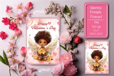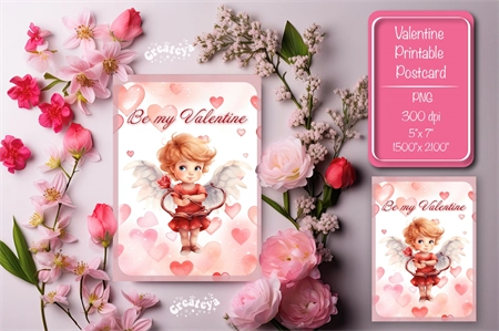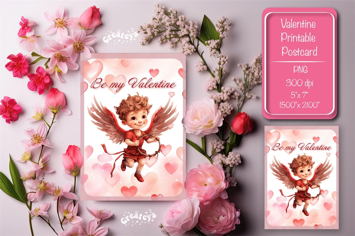 Valentine's card with Watercolor angel PNG. Printable postcard use this postcard to create a greeting card for your loved one!