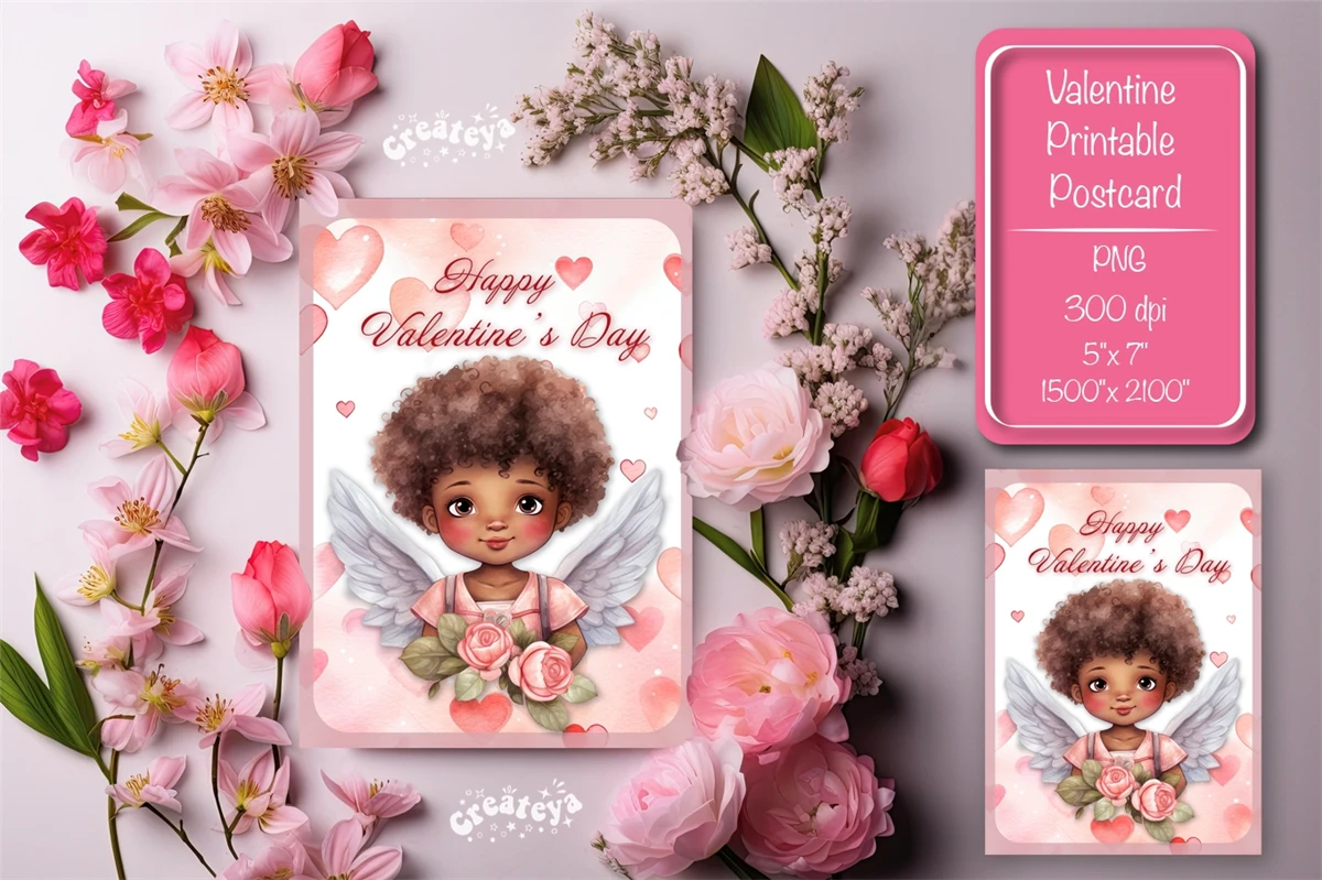 Valentine's card with Watercolor angel PNG. Printable postcard use this postcard to create a greeting card for your loved one!