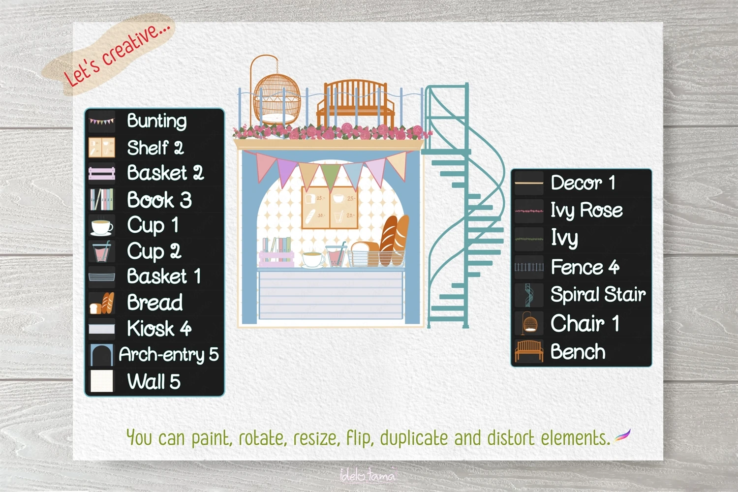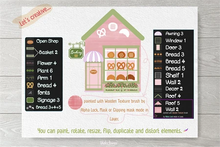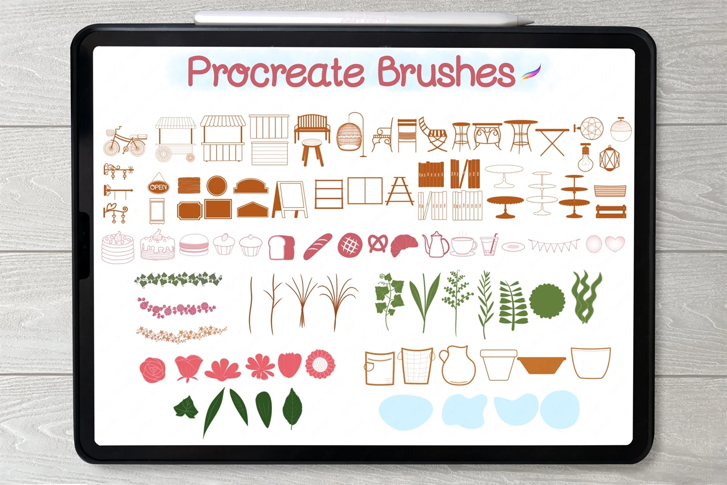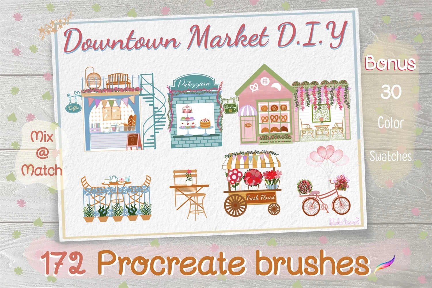 172 Add-ons Downtown Market DIY easy to mix&match creative design exterior Architecture Display element Decoration Store Procreate stamp and strokes brushes set. Included Kiosk, Stall, Built Shop, Store, Signage, Roof, awning, wall, decoration, Display, window, door, entry, arch, flower, florist, plant, leaf, branch, book, cake, bread, stair, chair, table, bicycle and texture brushes.