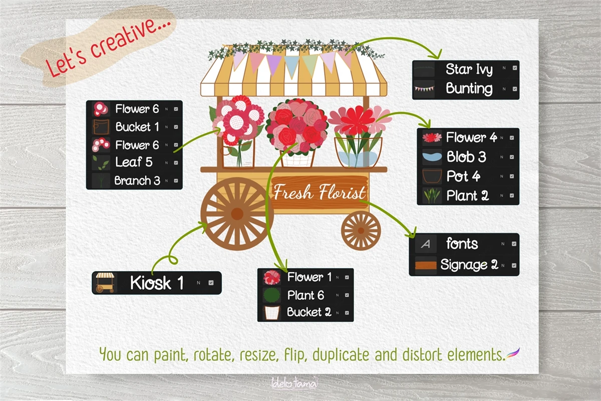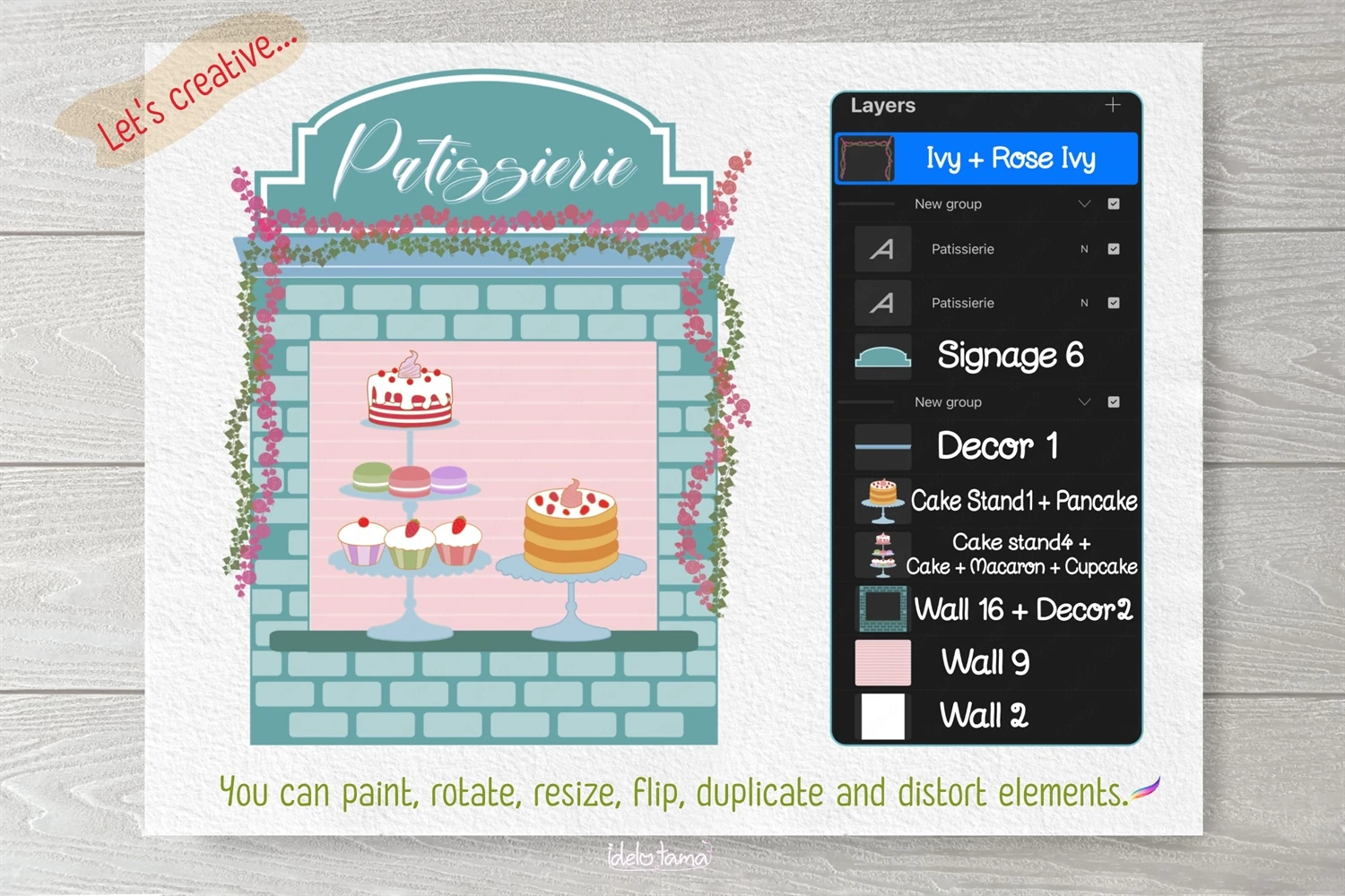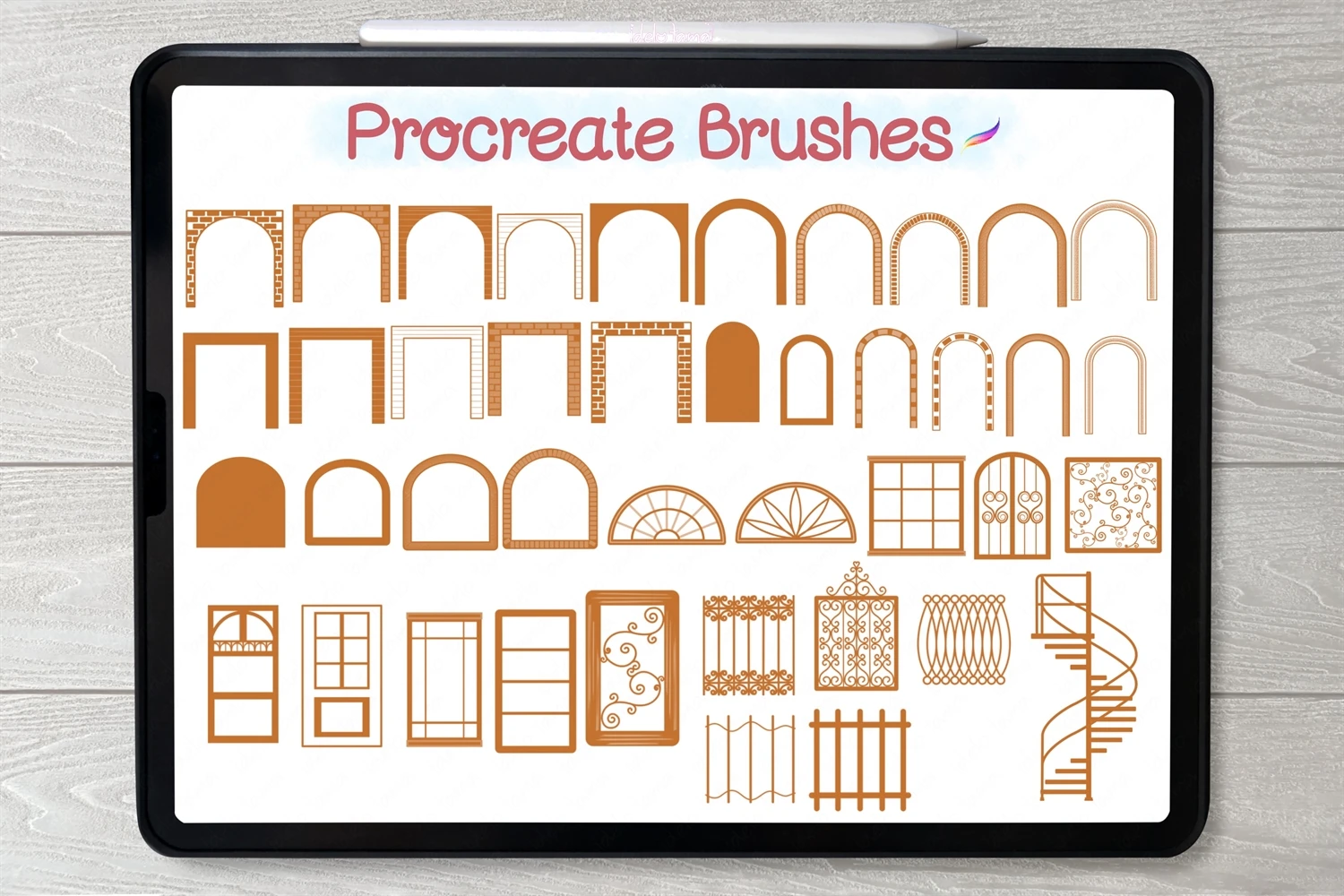 172 Add-ons Downtown Market DIY easy to mix&match creative design exterior Architecture Display element Decoration Store Procreate stamp and strokes brushes set. Included Kiosk, Stall, Built Shop, Store, Signage, Roof, awning, wall, decoration, Display, window, door, entry, arch, flower, florist, plant, leaf, branch, book, cake, bread, stair, chair, table, bicycle and texture brushes.