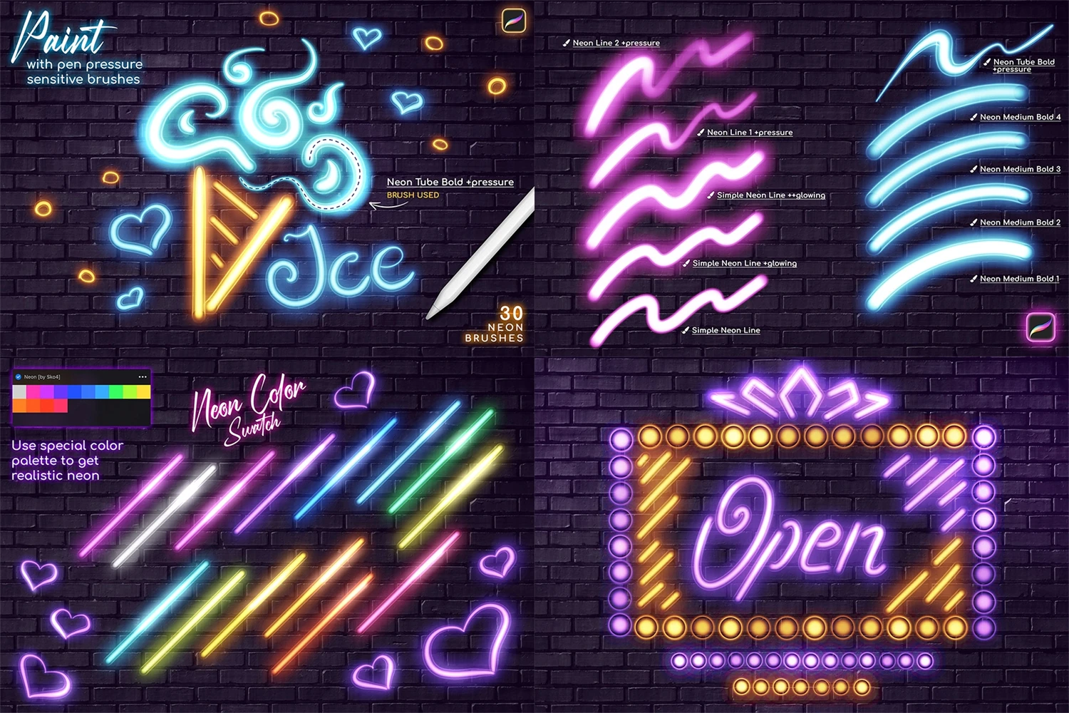 From basic brushes - outlines, pencils, markers, watercolors, to special effects like fur, feathers, snow, terrazzo, bubbles, stitches. Also you'll get glowing brushes - neon, light painting, sparks, fire. Chalk, spray, grain and more!