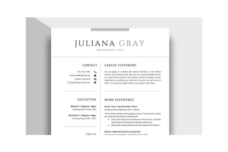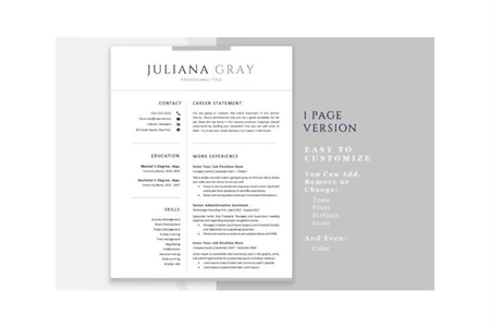 One Page Resume Template. Two Page Resume Template. Three Page Resume Template. Reference Page Template Cover Letter Template Microsoft Word (.docx) files A4 and US Letter Paper size version. 100 + Extra Icon set. Step-by-step Instructions Guide. Helpful tips and tricks with Action Verbs Friendly Customer Service I am always there for you to help. Just give me a message or email.