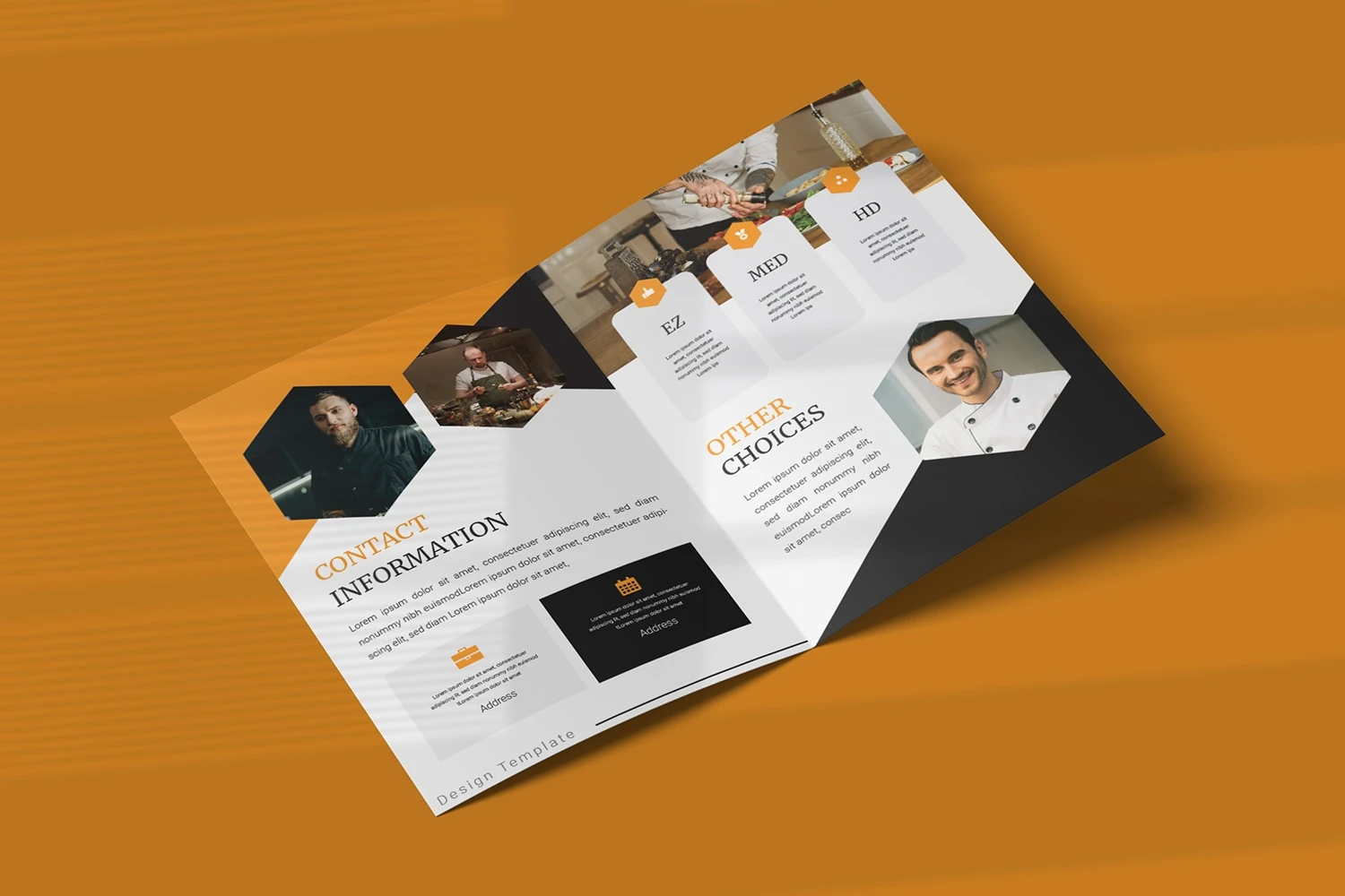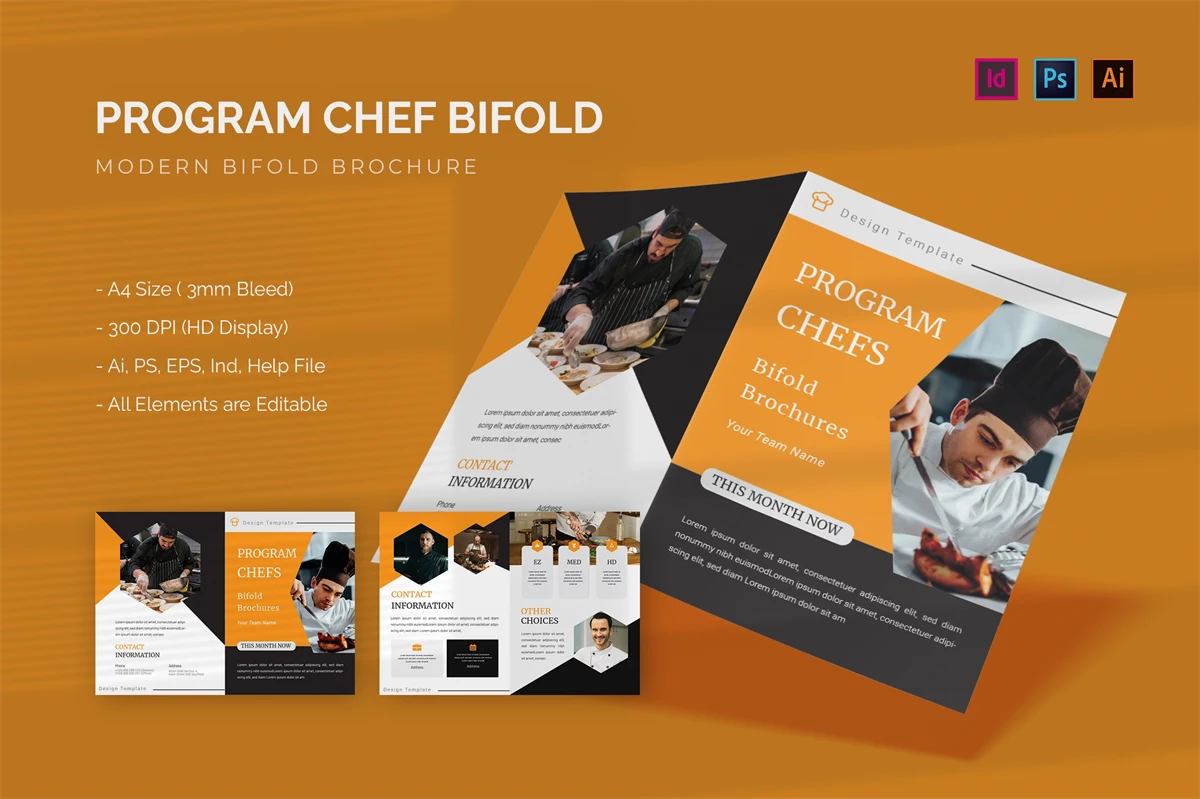 Program Chef - Bifold Brochure We present this Bifold Brochure for you, simple and very elegant, and this Bifold Brochure is suitable for all types of your business, made with Adobe InDesign (INDD), Adobe Photoshop (PSD) and Adobe Illustrator (AI), very easy to customize, Hope you Like it, dont forget to rate, Thanks.