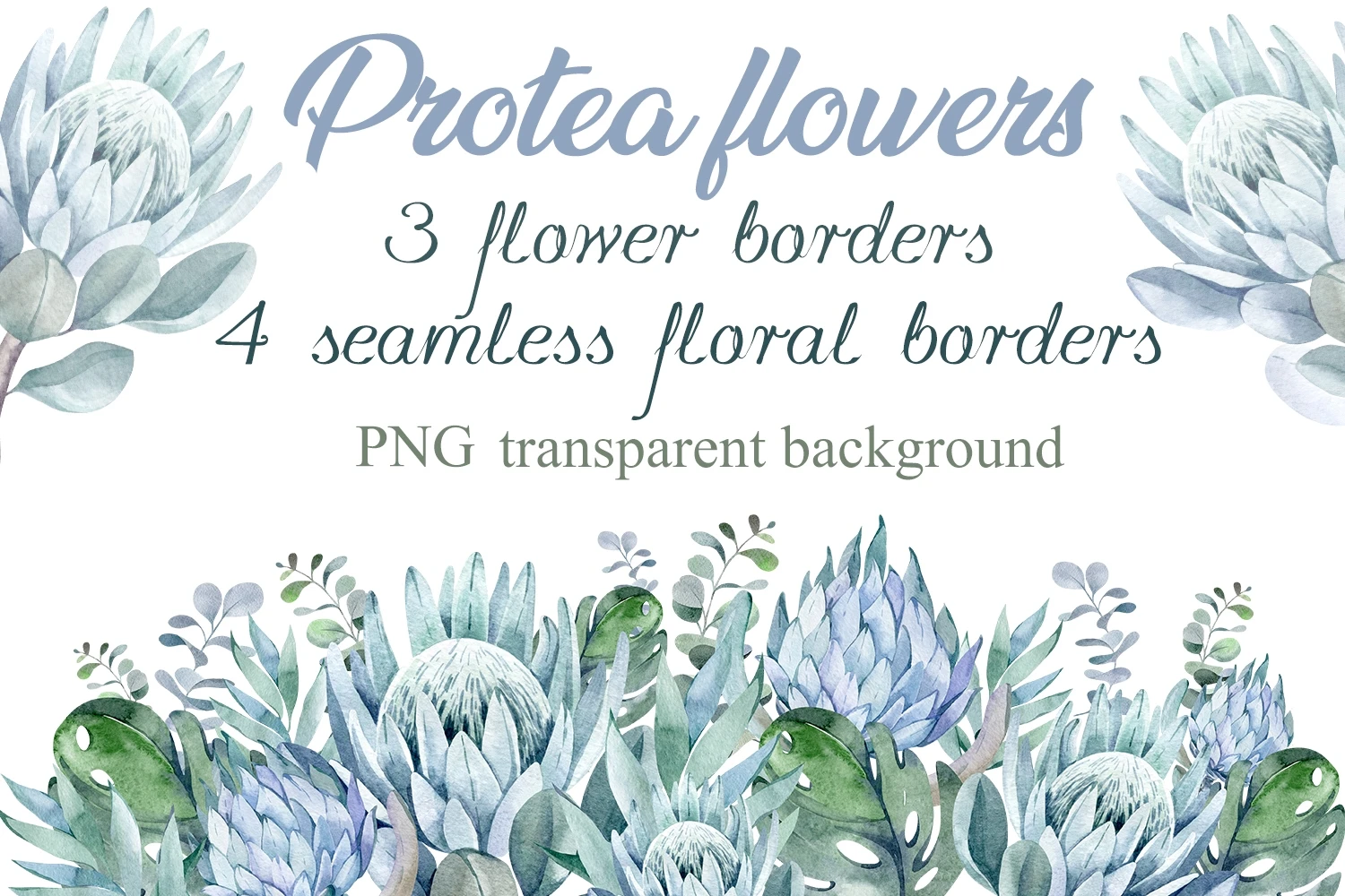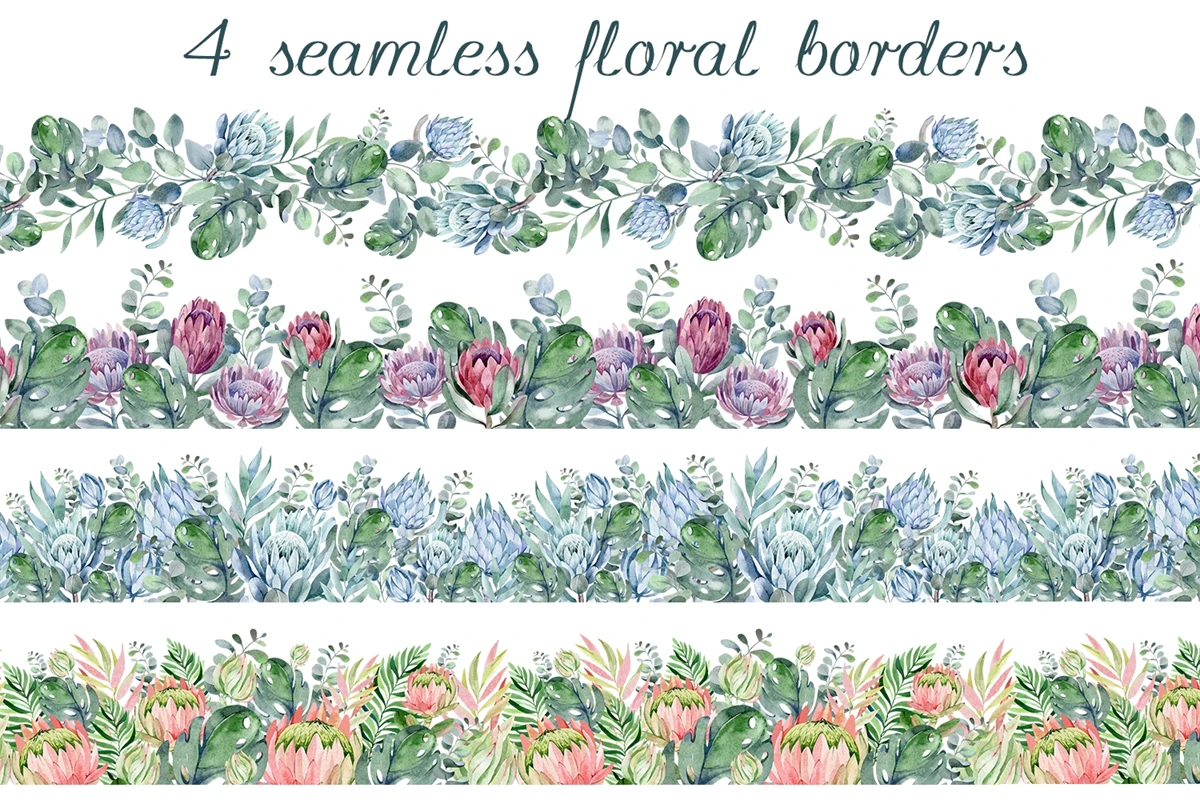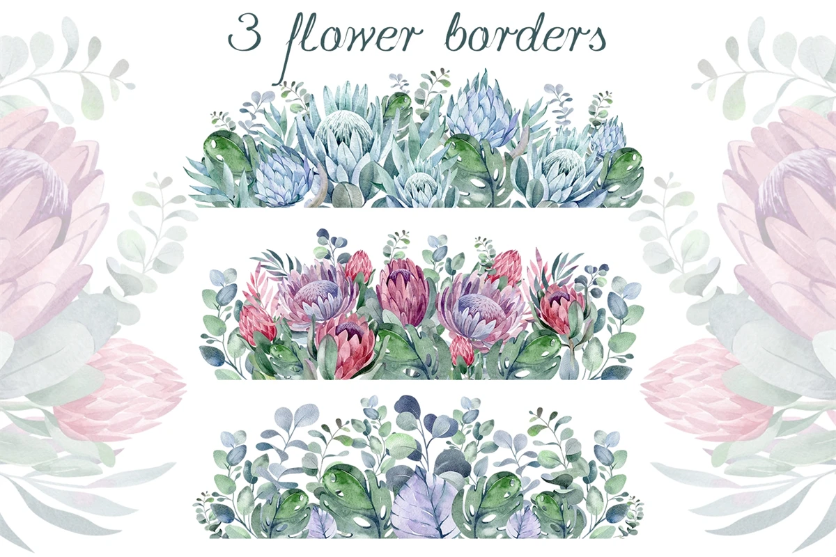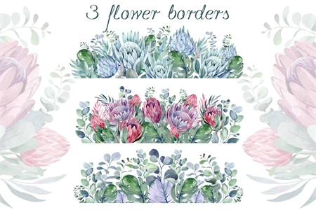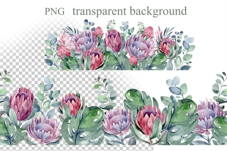 This is a set of tropical flowers and plants. 7 flower borders on a transparent background. PNG format. Made in watercolor technique. Perfect design for DIY, sublimation, wedding invitations, greeting cards, apparel, blogs, posters, decor and more.