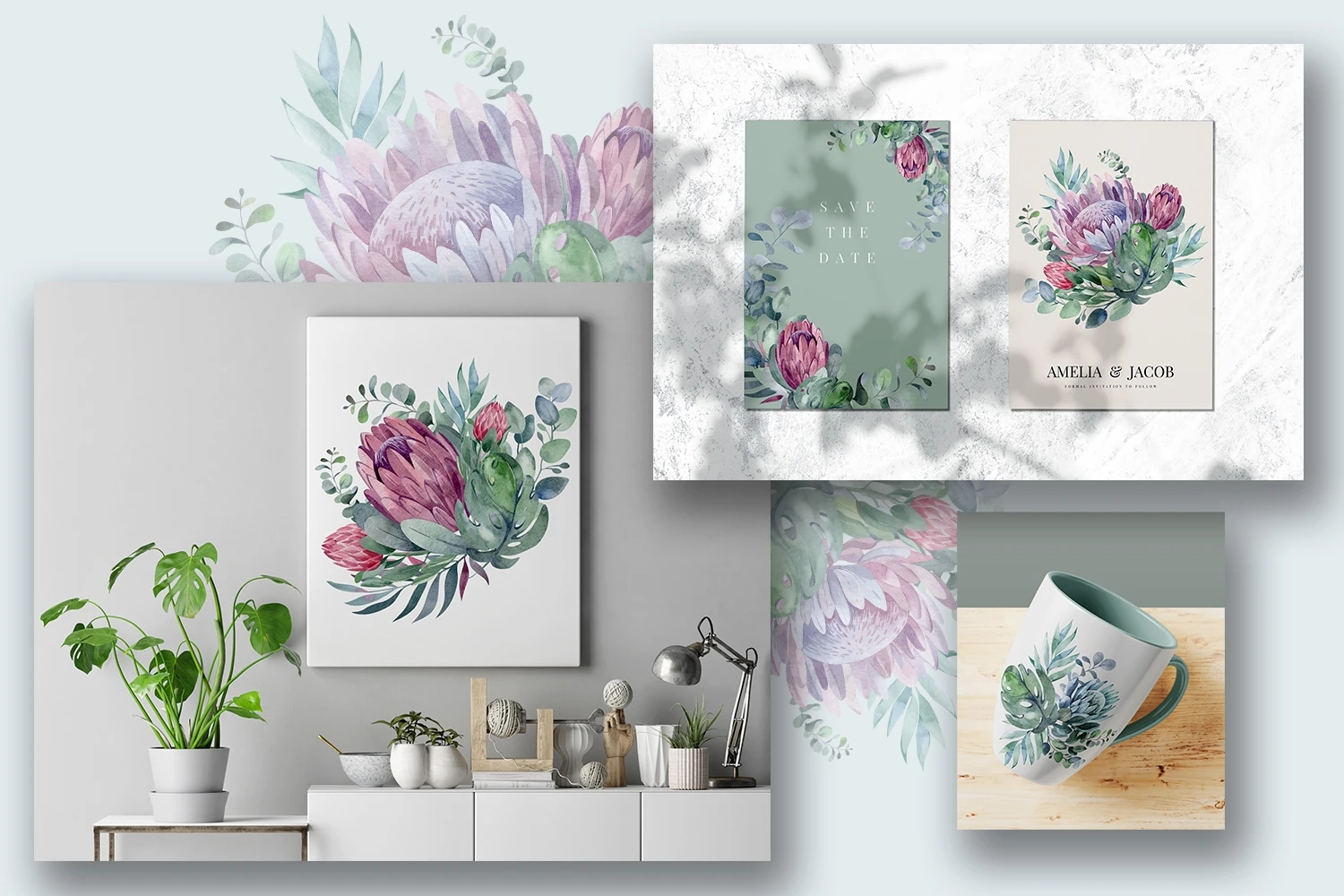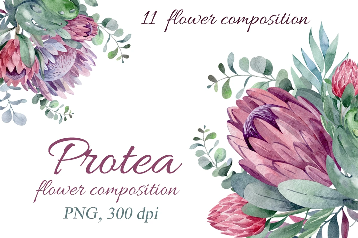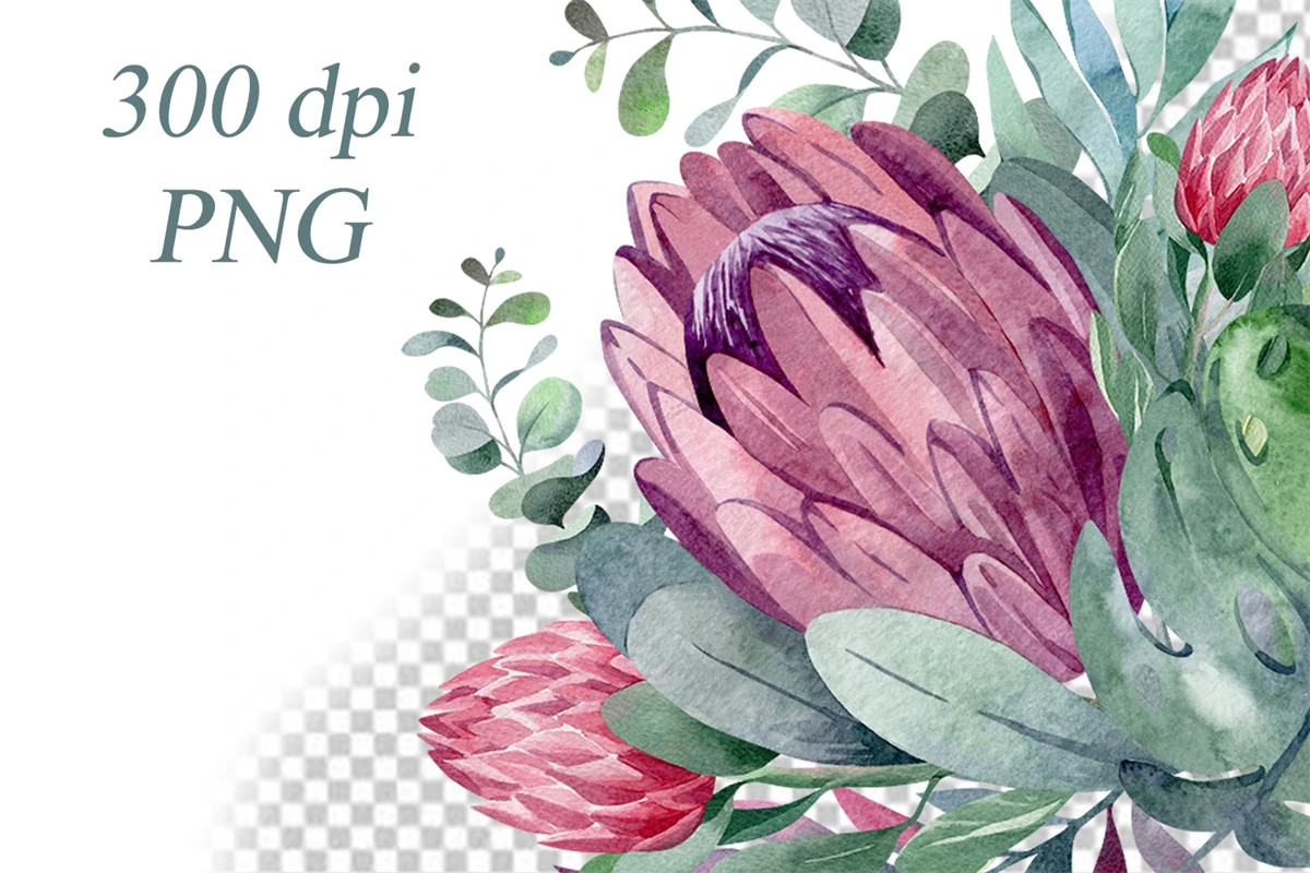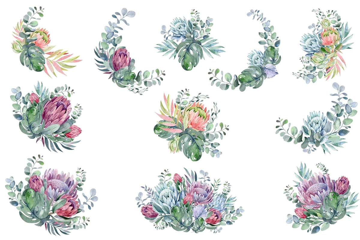 This is a set of tropical flowers and plants. 11 flower compositions on a transparent background. PNG format. Made in watercolor technique. Perfect designs for crafts, sublimation, wedding invitations, greeting cards, clothing, blogs, posters, decor and more.