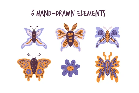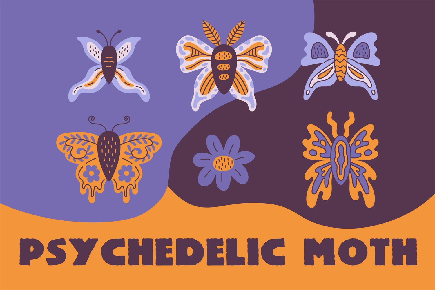 Trendy hand-drawn psychedelic moth and butterfly illustrations. Mystical insects with wings in doodle style. Modern mystery vector illustration for sublimation, print, greeting card, stickers, kids, frame art, esoteric topics, etc.