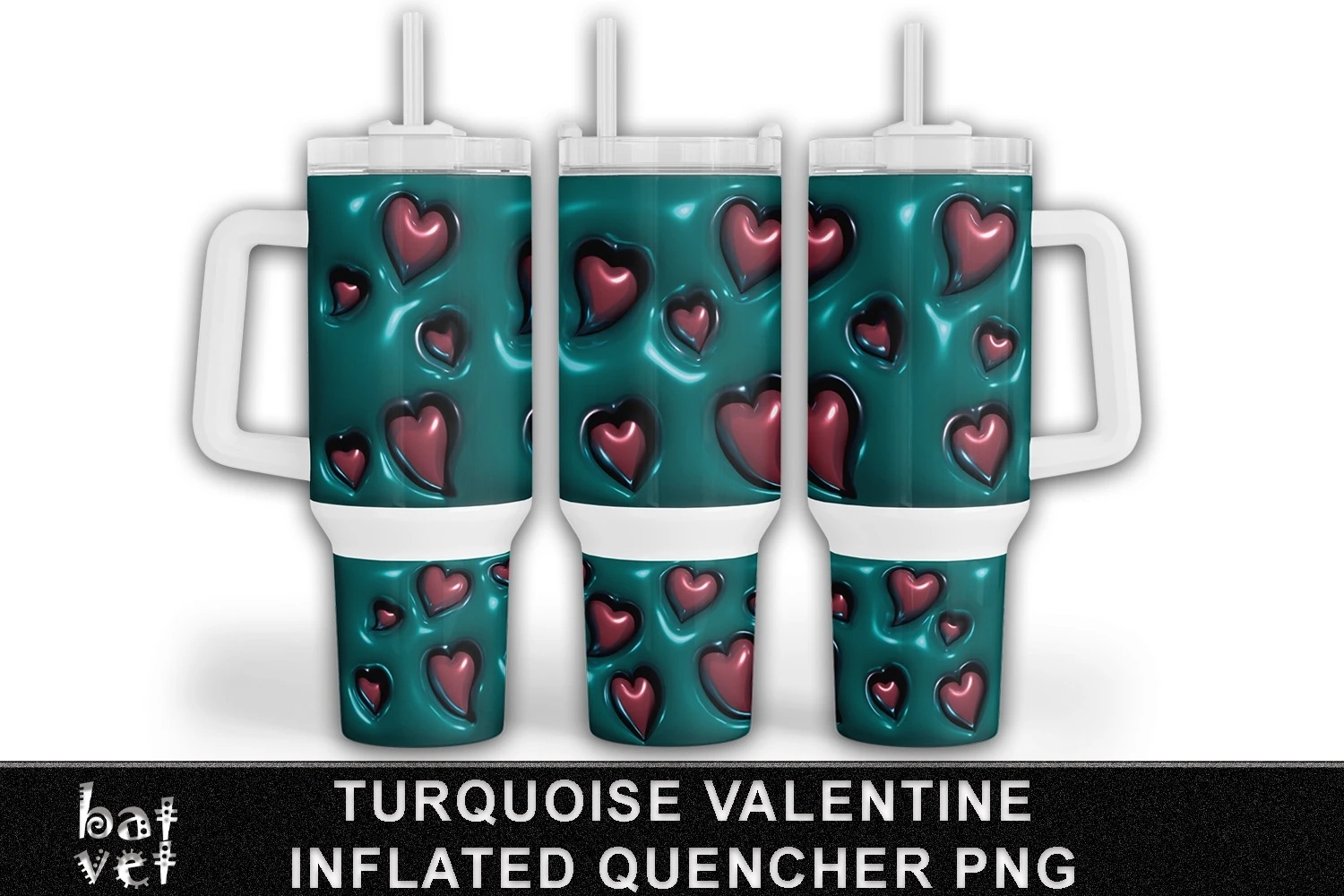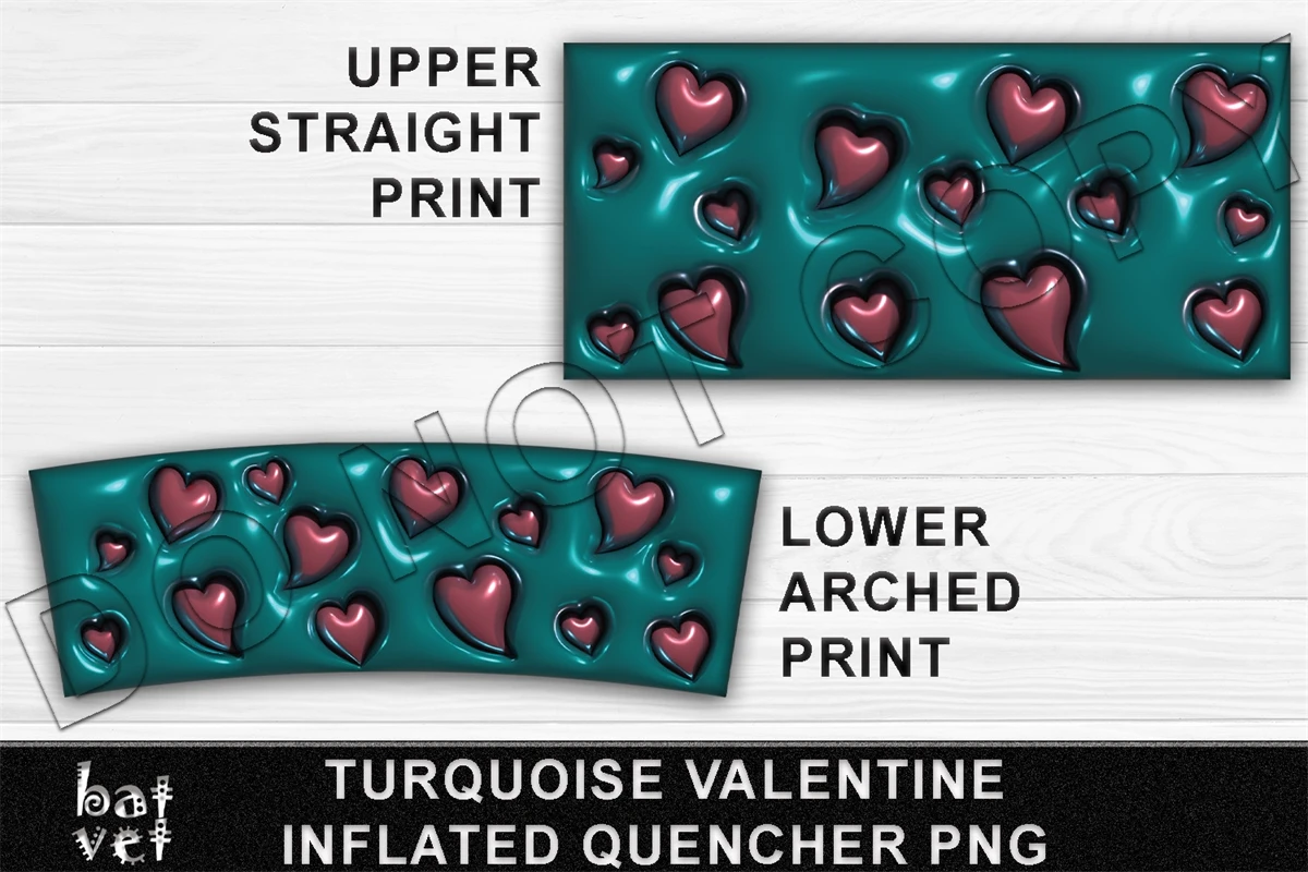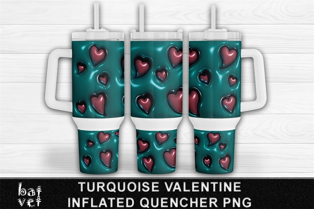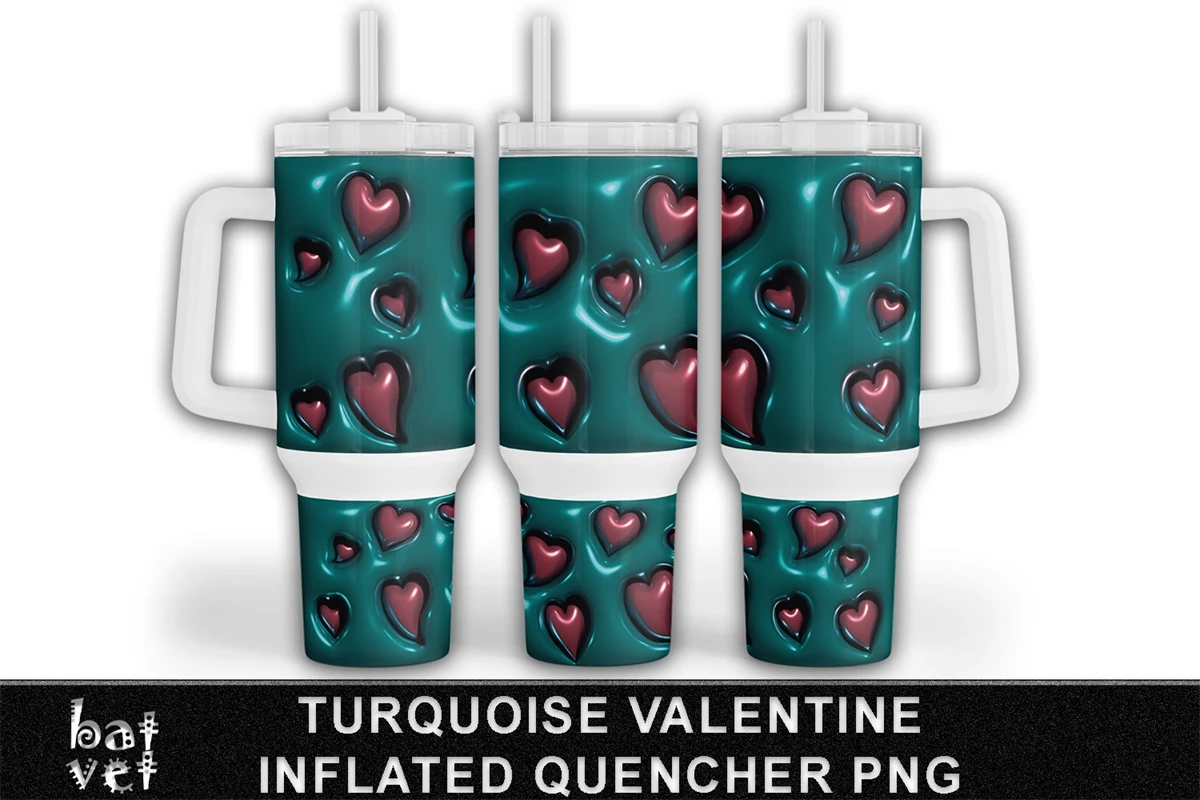 Valentine Tumbler 40 Oz Quencher Turquoise Bubble Wrap and Hearts Sublimation - Upper Straight and Lower Arched Print.