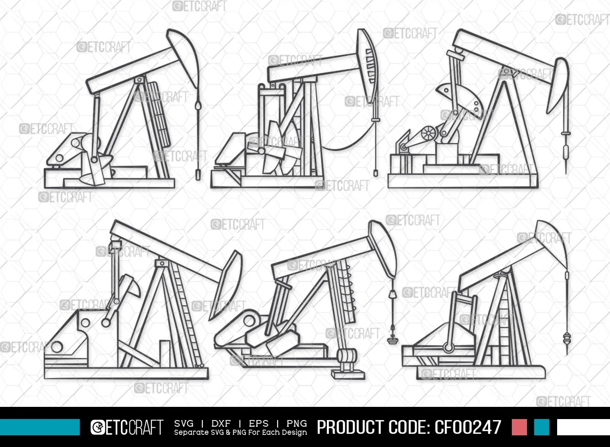 Enhance your design projects with our "Pump Jack Outline Oil Derrick Petroleum Rig SVG Cut File Bundle." This comprehensive bundle offers a versatile collection of meticulously crafted outlines featuring pump jacks, oil derricks, and petroleum rigs, all in SVG format. It's the perfect resource for adding an industrial and oil-themed touch to your creative endeavors.
