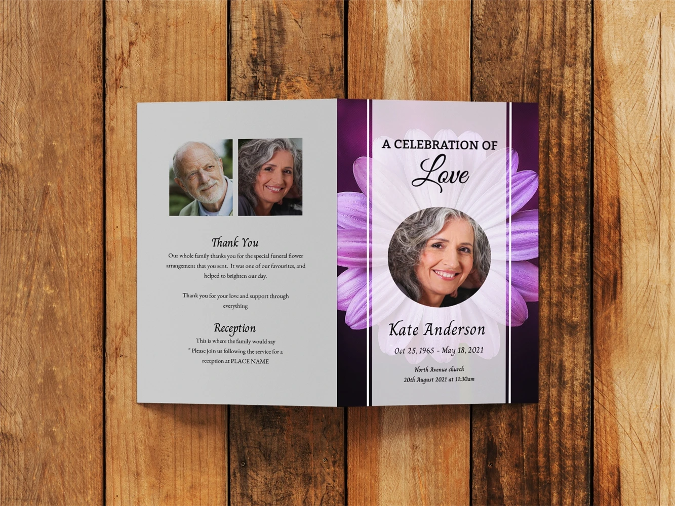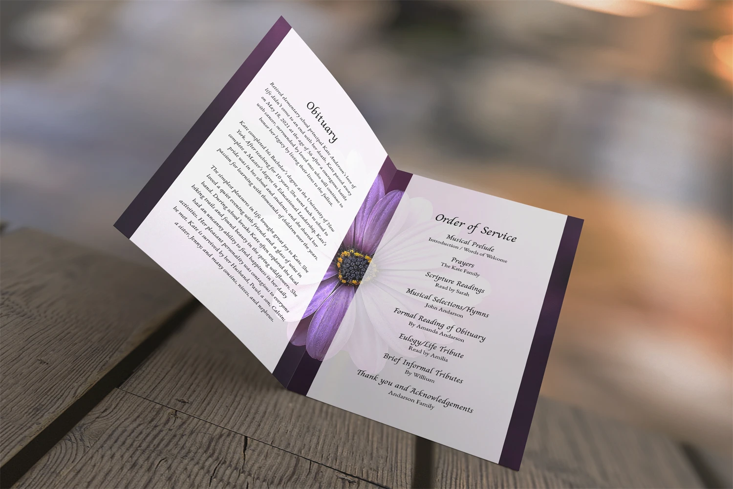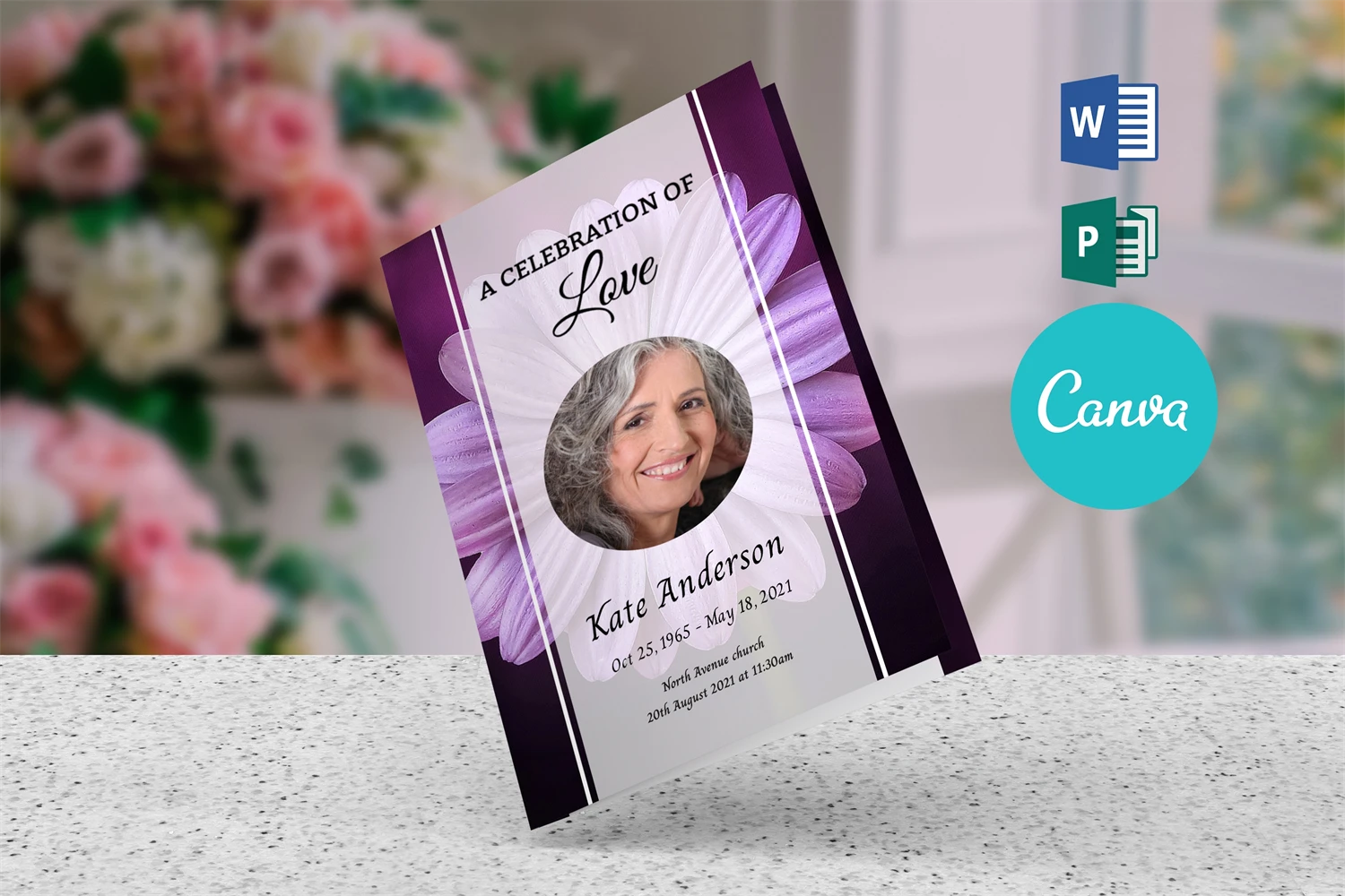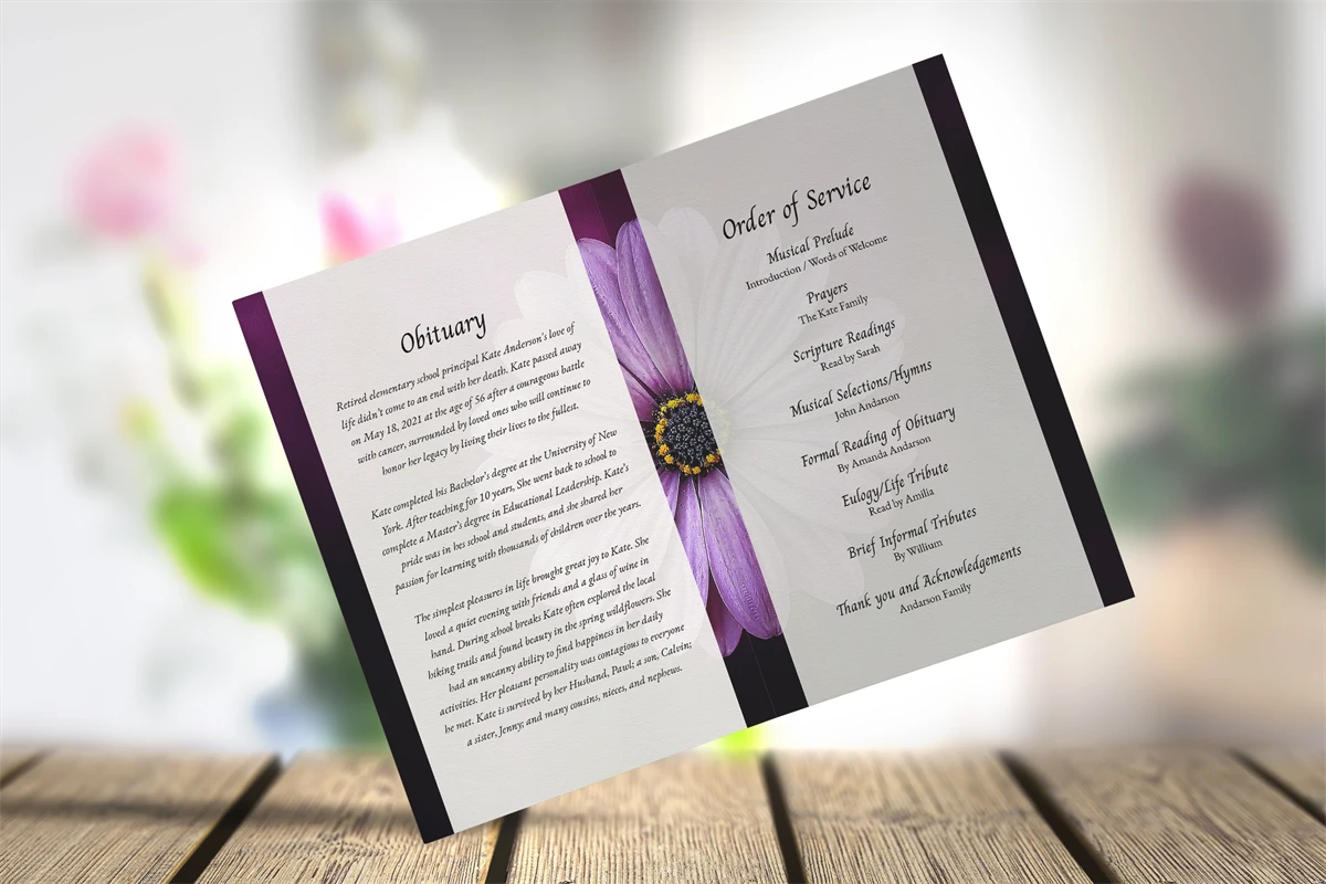 Create a heartfelt tribute with our Editable Purple Daisy Funeral Program Template, a customizable 4-page booklet for celebrating a loved one's life, available in Word, Publisher, and Canva formats.