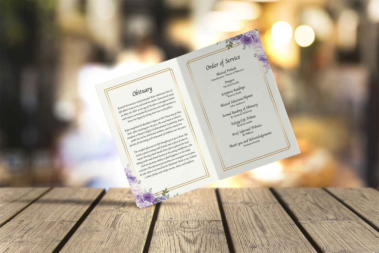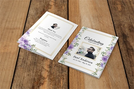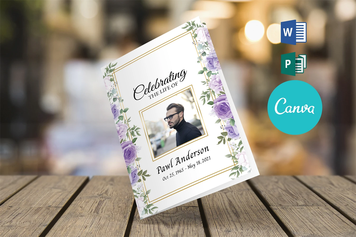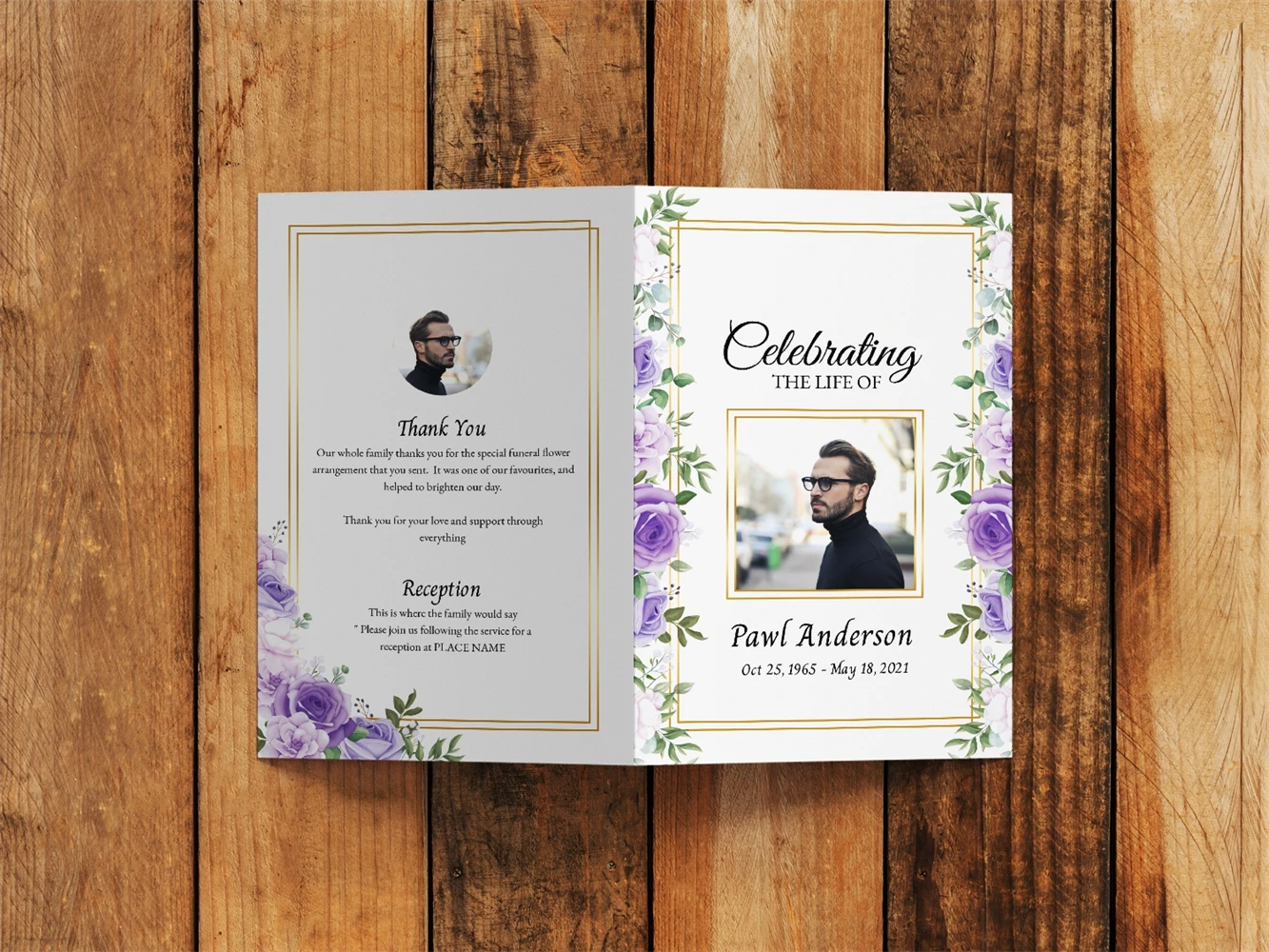 Funeral program template 4 page for Men with Purple Floral Background. This template is a great way to honor your loved one.