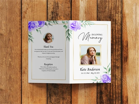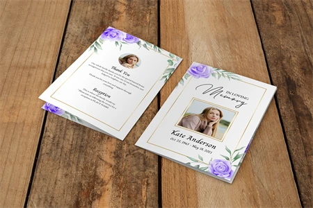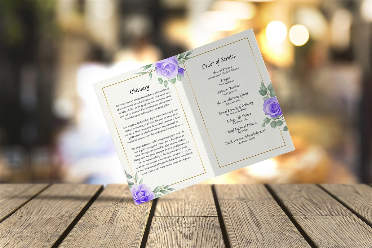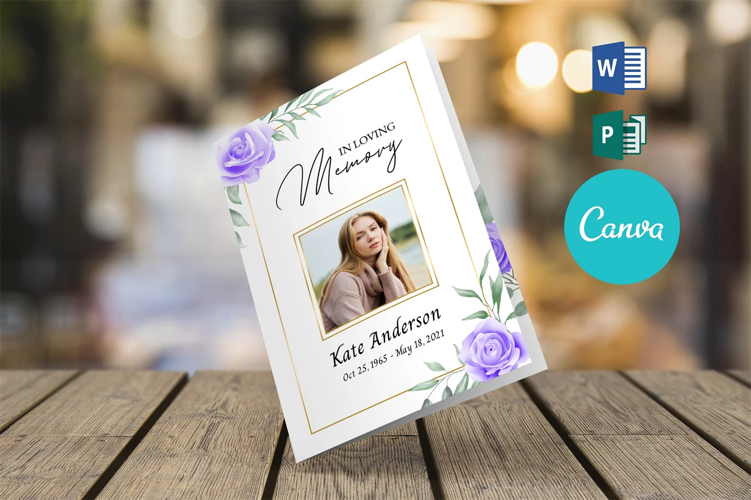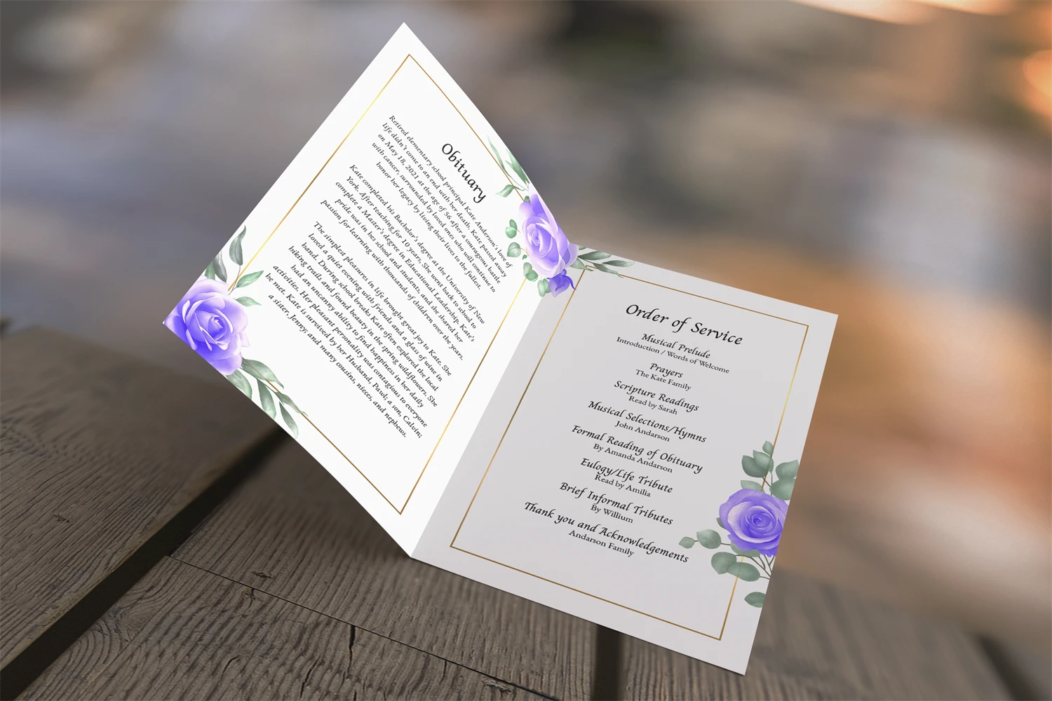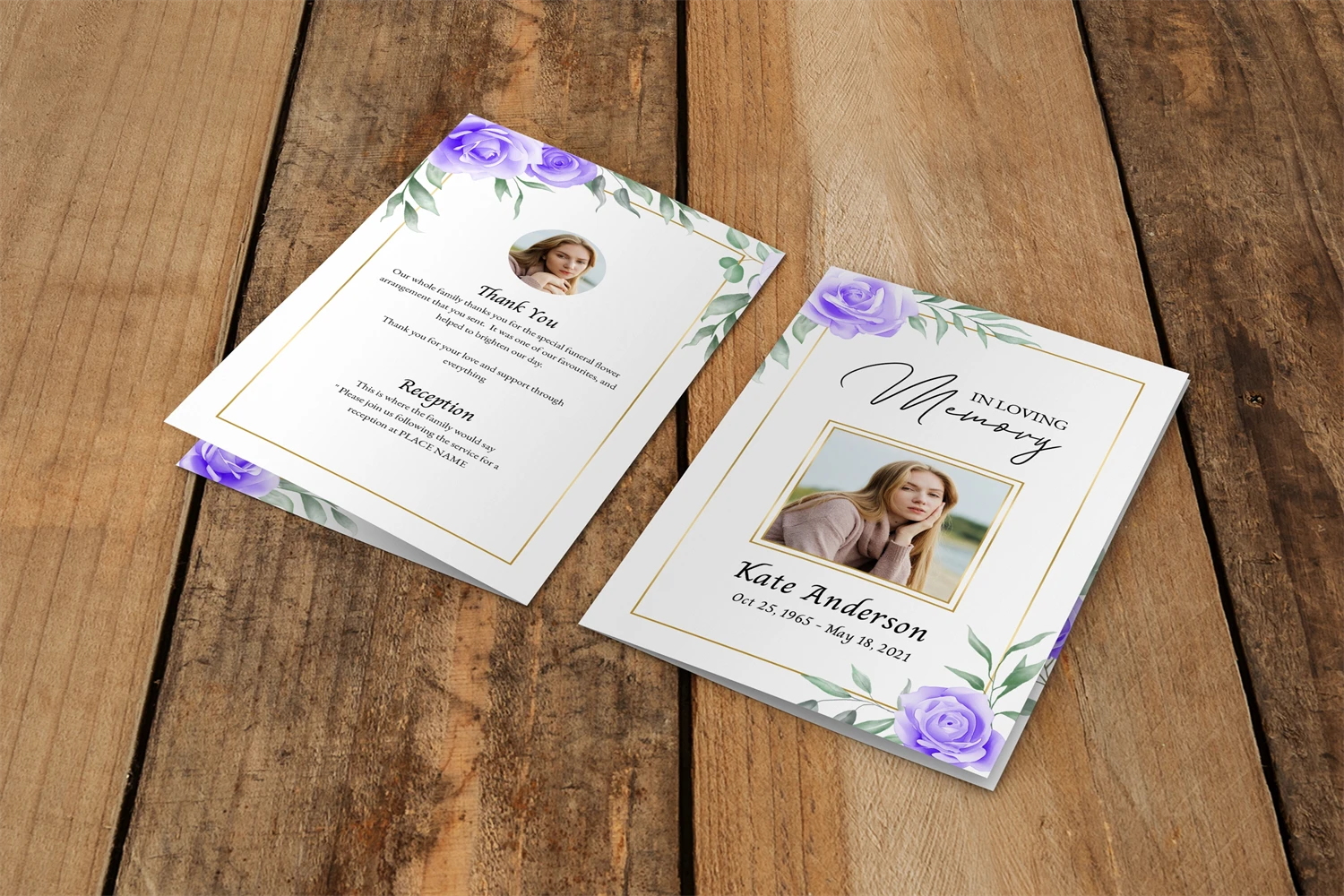 Funeral program template 4 page for Men with Purple Rose and Gold frame Decoration. This template is a great way to honor your loved one.