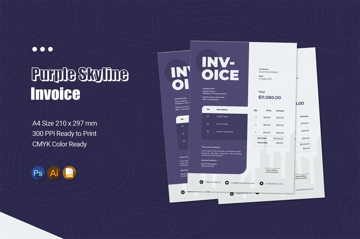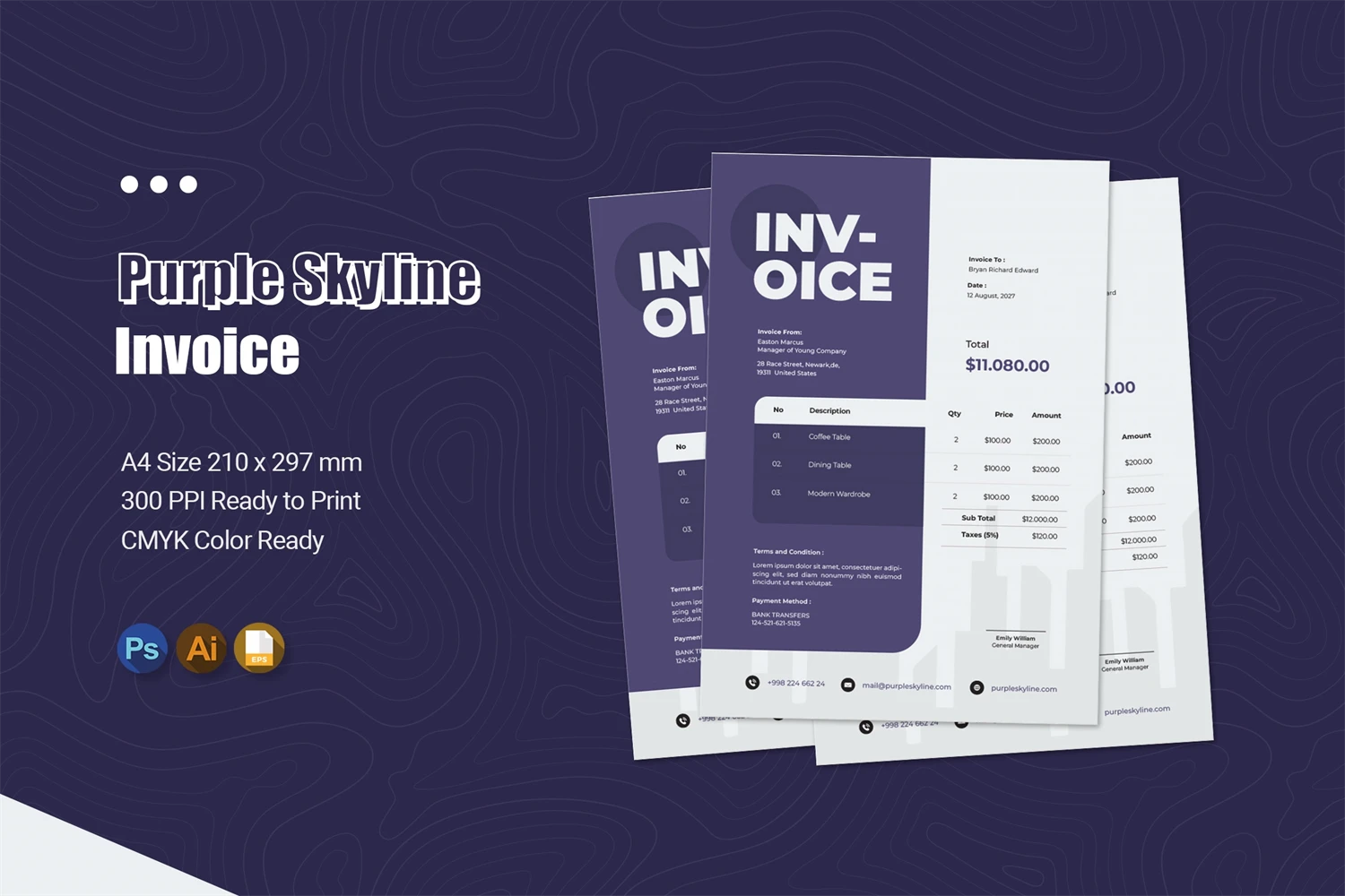 Use our invoices to make your bookkeeping easier and to impress your clients with an invoice display that has a modern, elegant design and strong typography. This invoice template is easy to use and customizable, making it perfect for any medium.