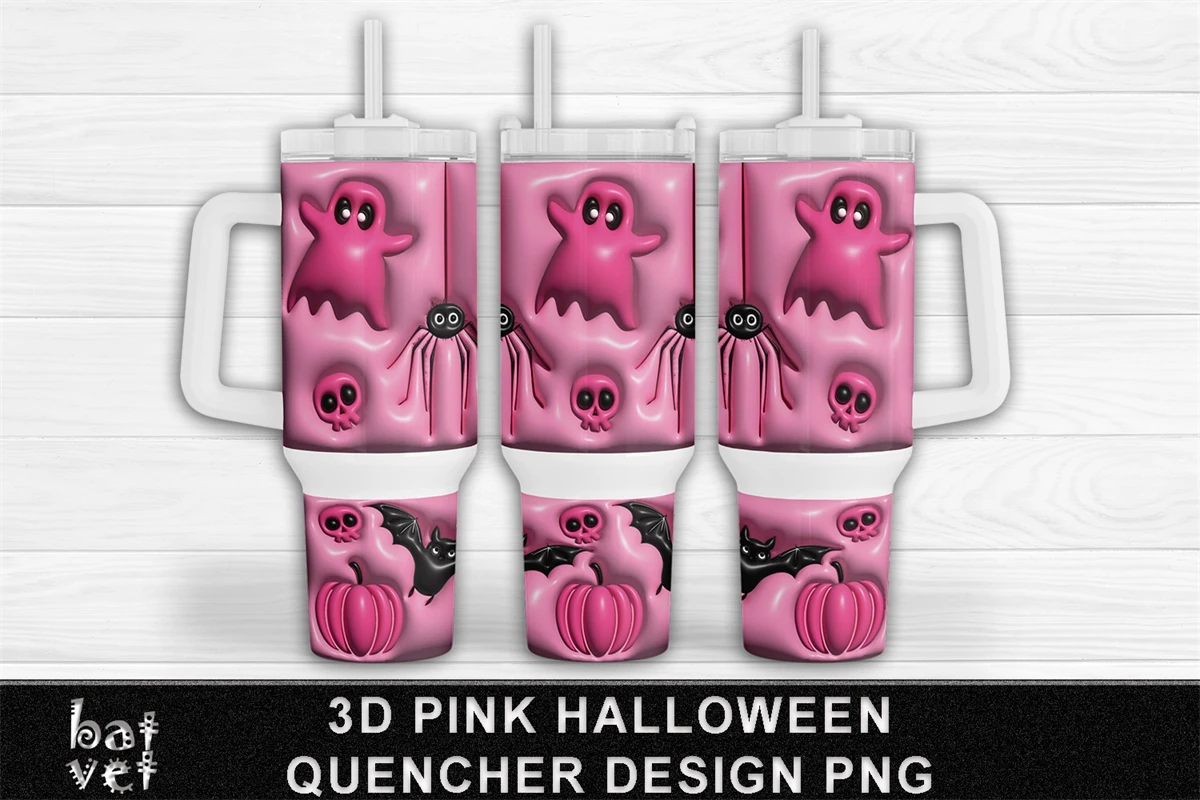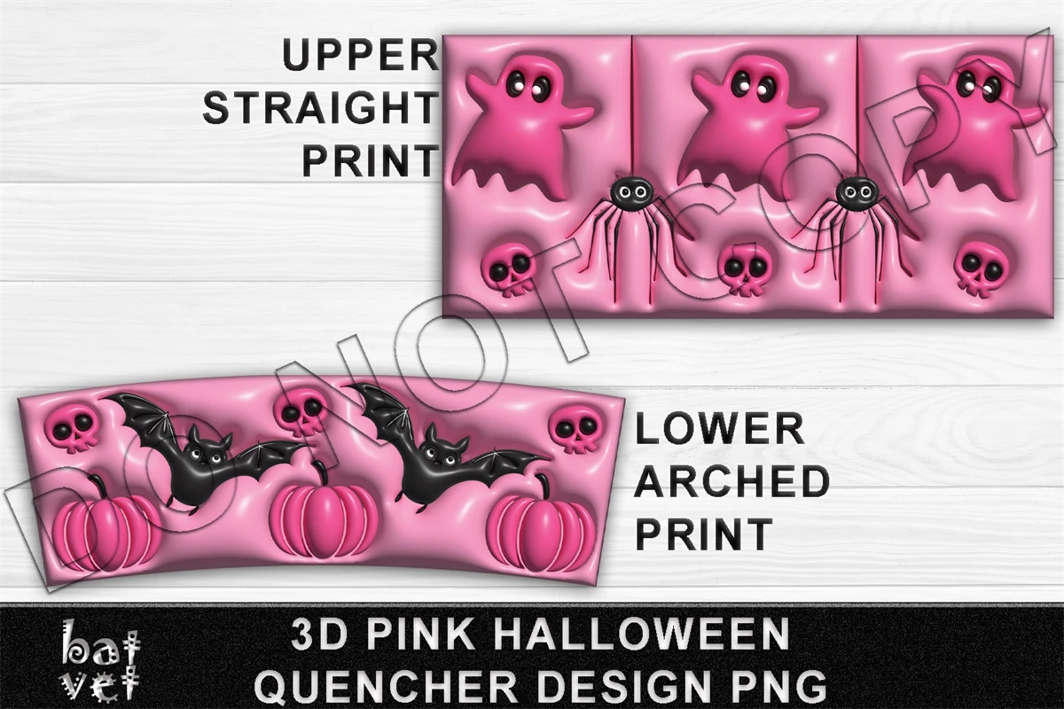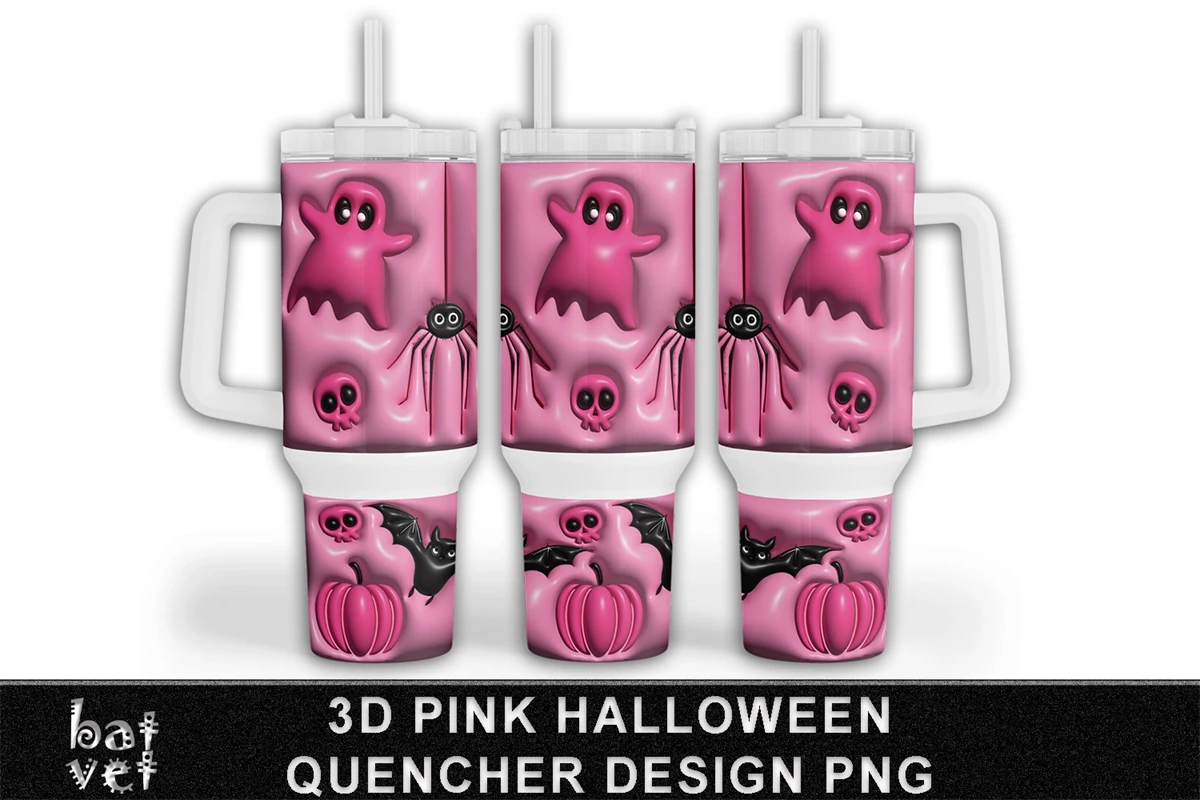 Bubble Wrap Tumbler 40 Oz Quencher 3D Halloween Pink Ghost, Spider, Pink Pumpkin, Bats, Pink Skull Sublimation Wrap. Two Part Sublimation - Upper Straight and Lower Arched Print.