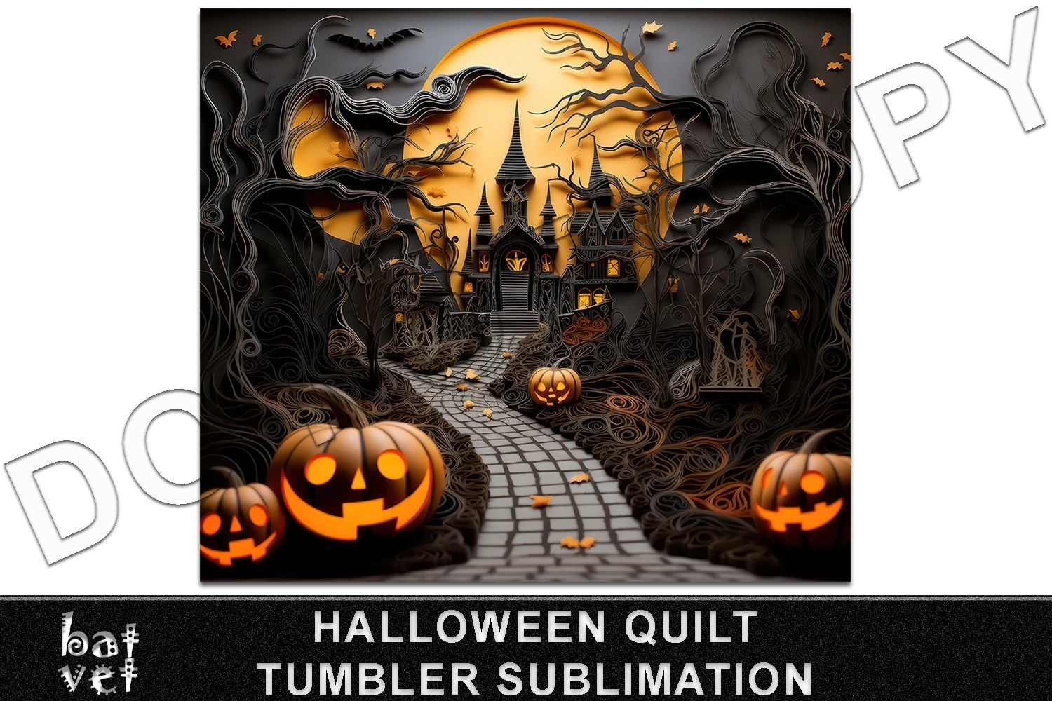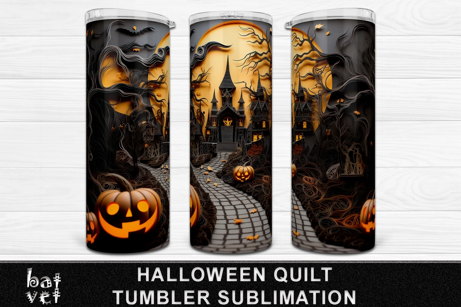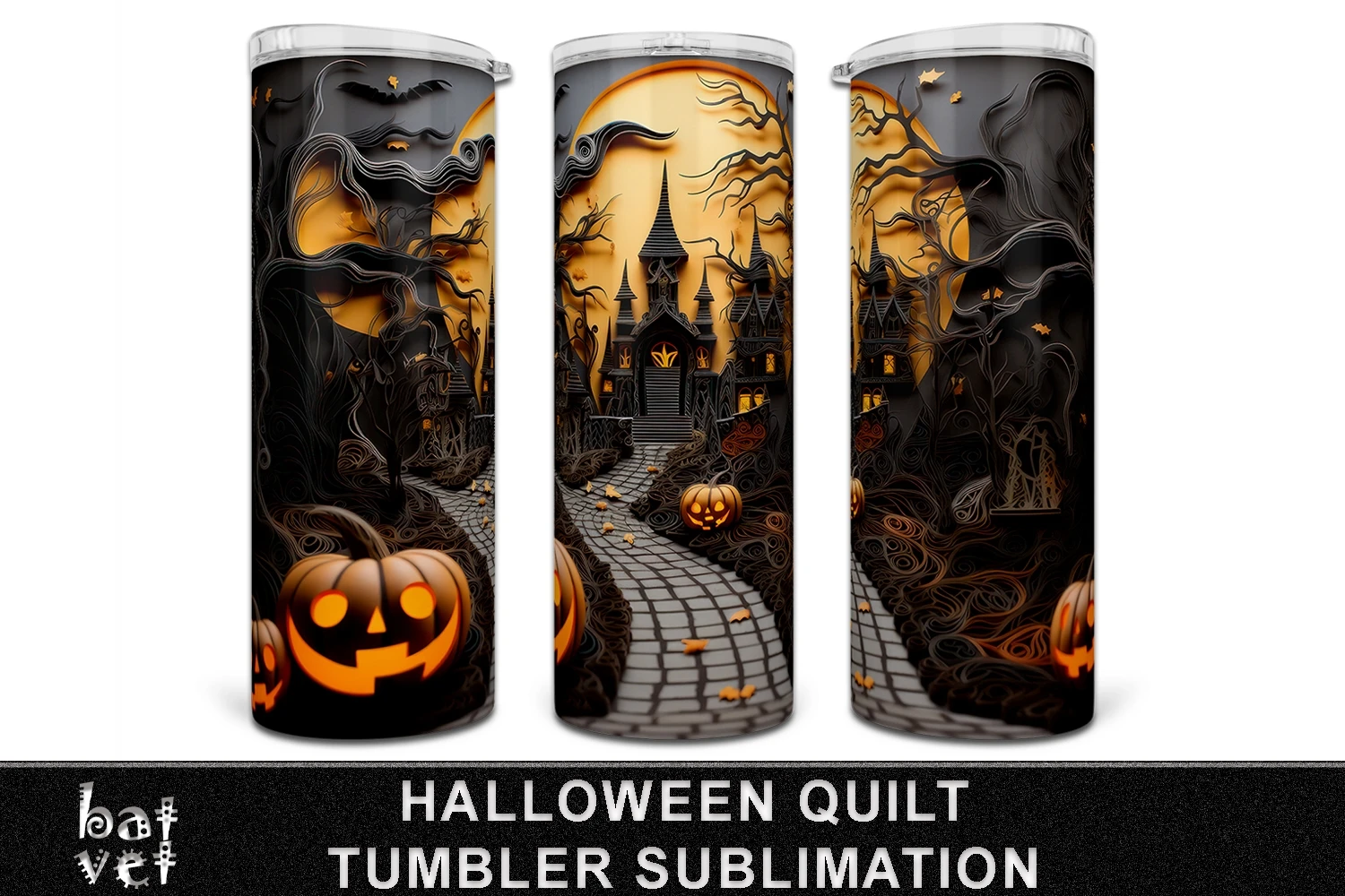 3D Quilt Halloween 20 Oz Skinny Tumbler Design, Haunted Mansion, Carved Pumpkins, Full Moon Paper Quilling Sublimation Print Design.
