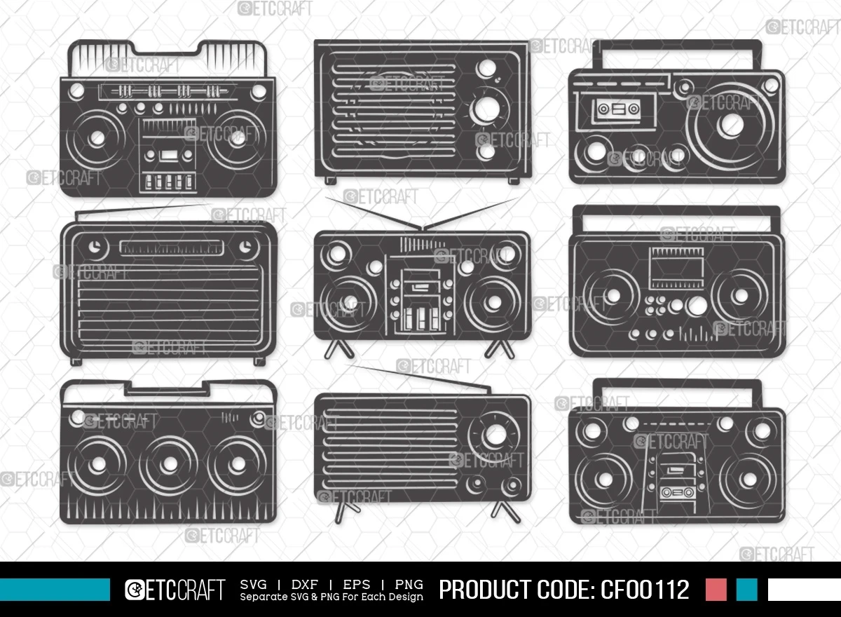 Immerse yourself in the beats of the past with our Radio Boombox Silhouette Cassette Tape Player SVG Cut File Bundle. Let these iconic designs inspire your creativity and add a retro musical vibe to your projects. Start crafting your nostalgic journey today!