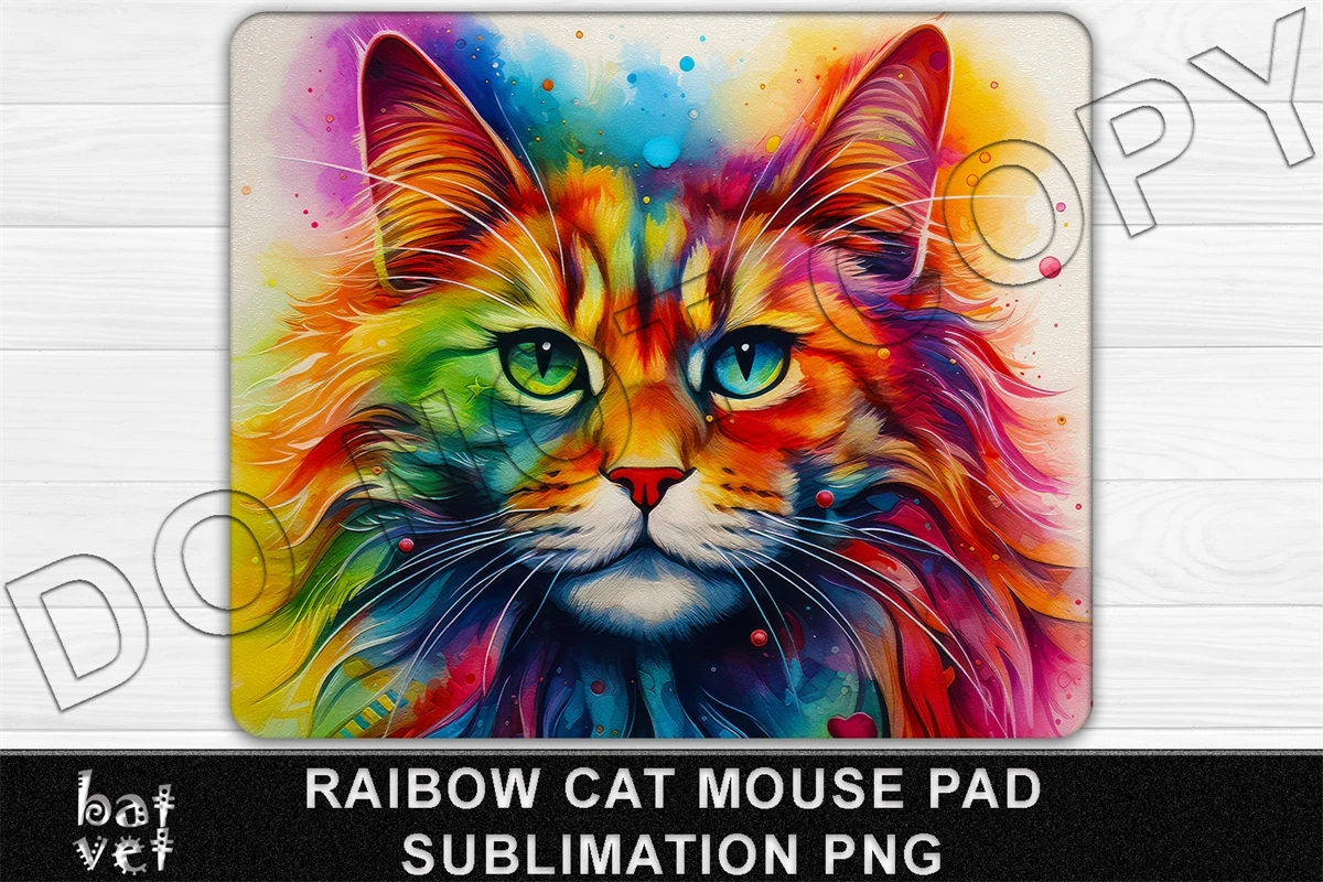 Watercolor Mouse Pad, Rainbow Cat Portrait Splash Sublimation.