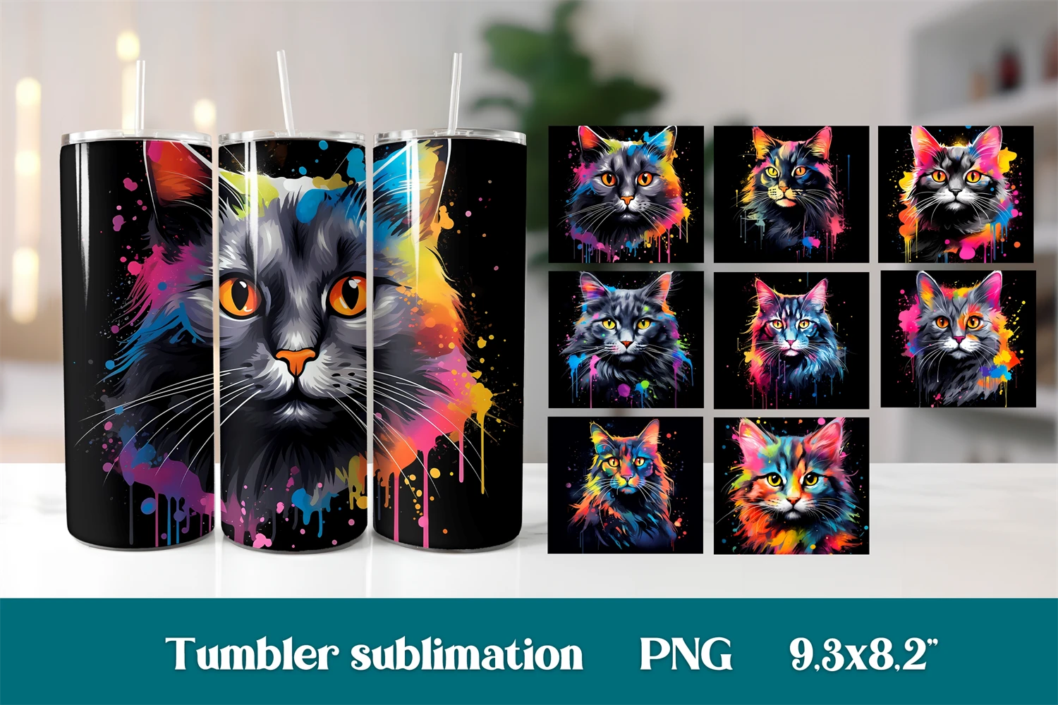 Rainbow cat sublimation tumbler bundle design wrap 20 Oz, cat animal tumbler wrap, rainbow cat sublimation design.