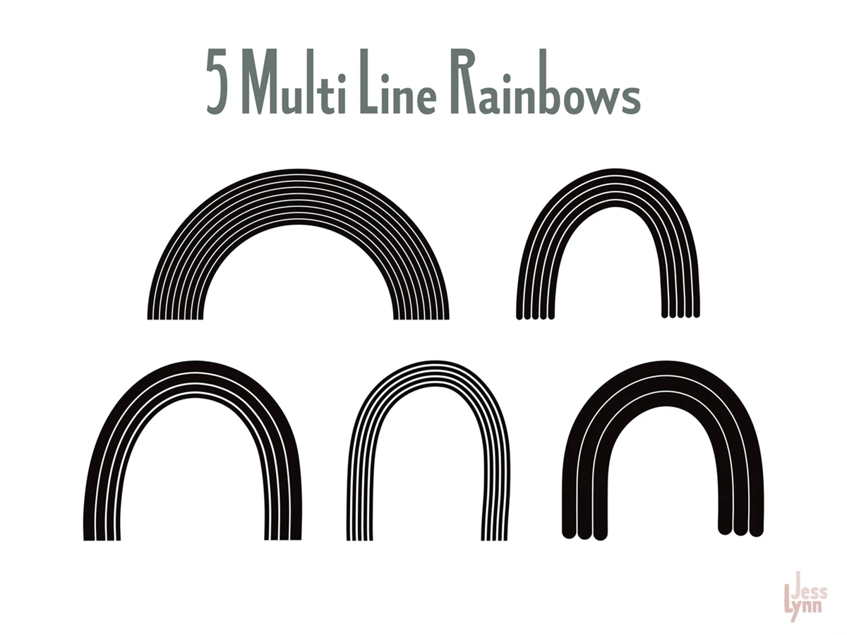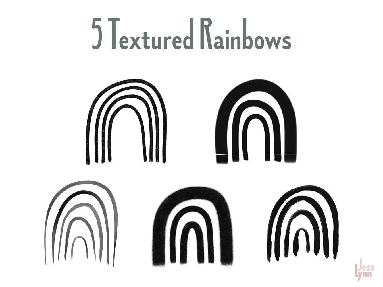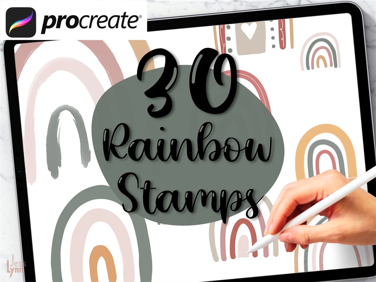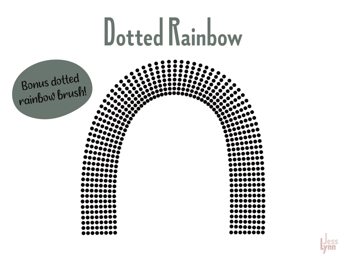 This Procreate brush set contains 30 original hand-drawn rainbow stamp brushes, and a special bonus dotted rainbow brush!