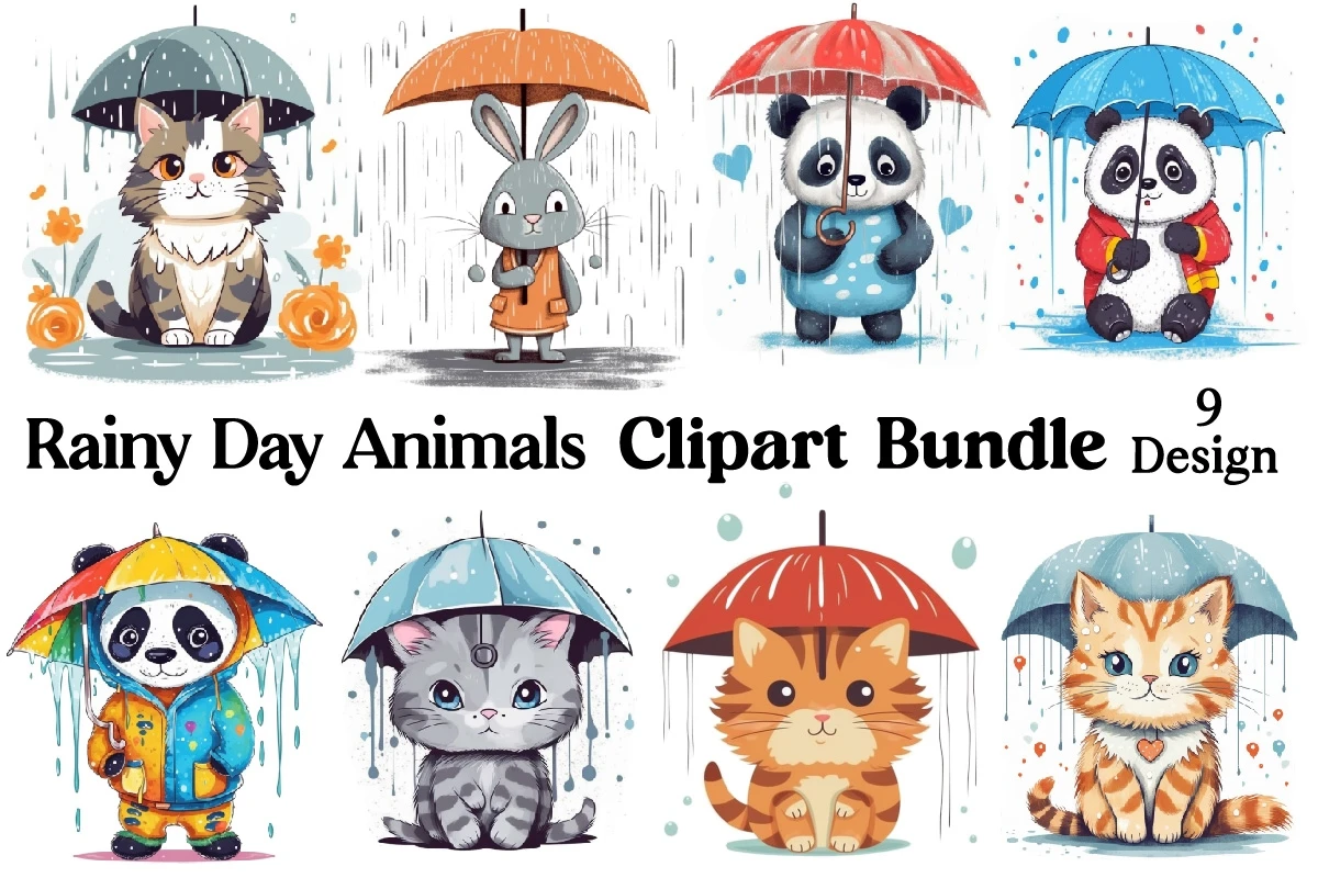 Watercolor Rainy Day Animals Clipart PNG Bundle